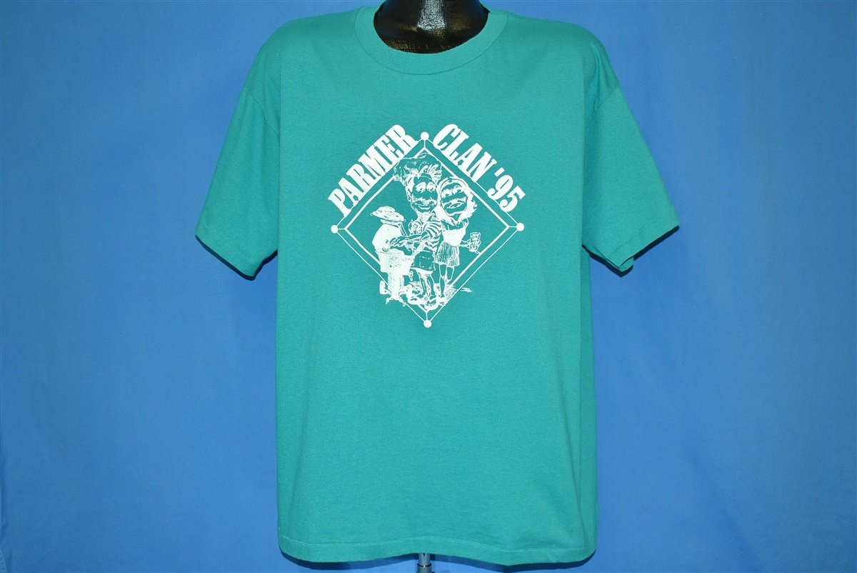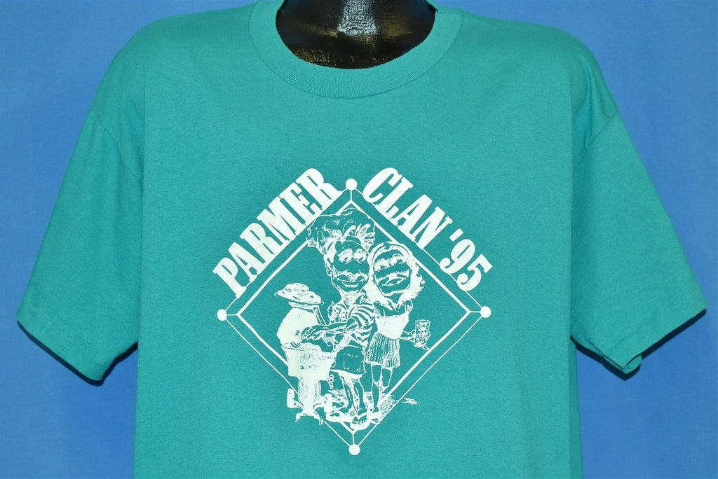This vintage tee was custom made in the 1995 for the Parmer Clan, which was probably a family reunion or cookout. It's held up great over the years and has tons of life left. Features a strong cotton feel, old school graphics, and a soothing teal color.
