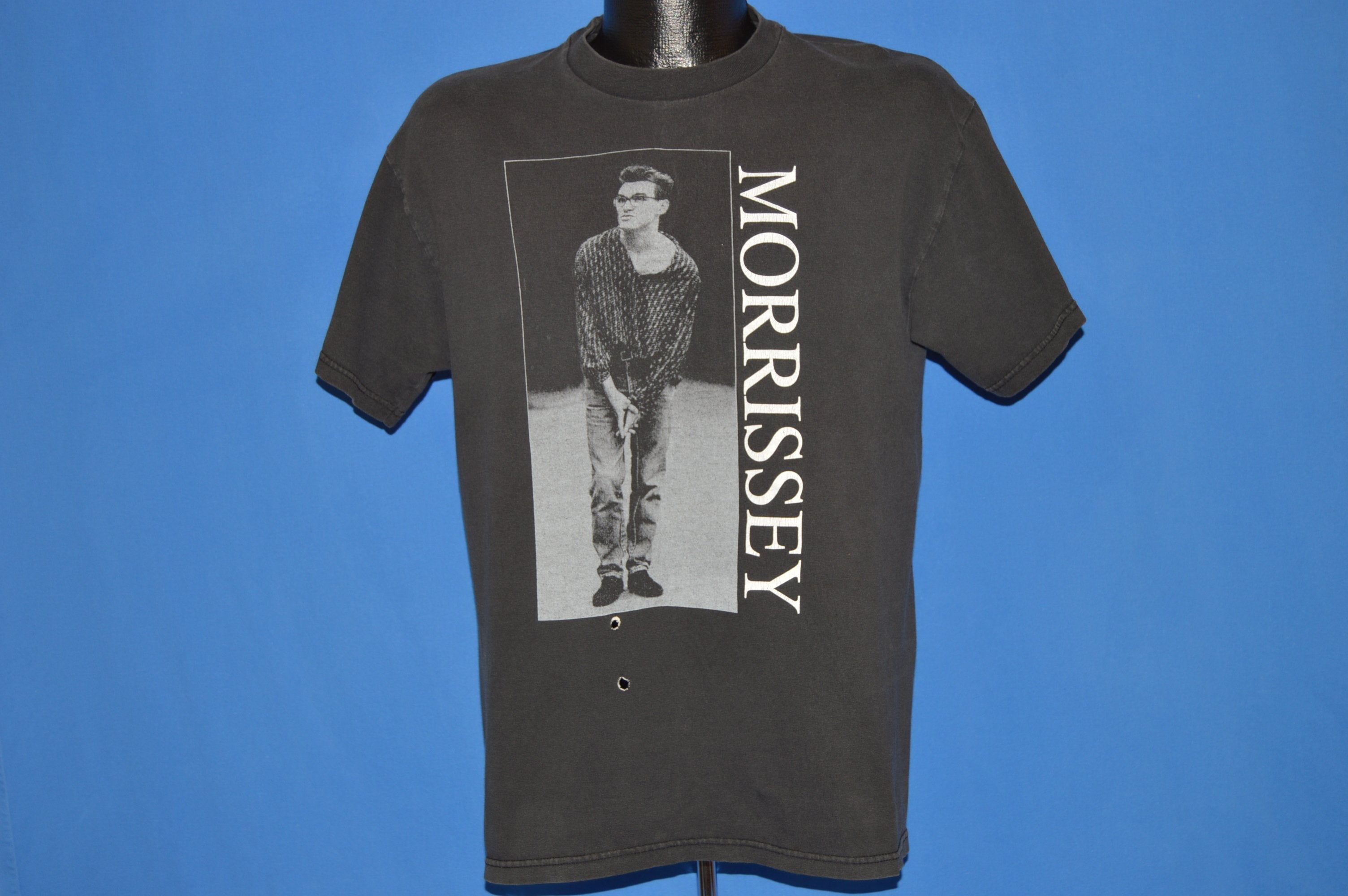 This shirt is from the 90s and features an image of Morrissey making a face, and includes the word "Morrissey" down the side. Steven Morrissey was the frontman of the English rock band The Smiths, and went on to have a successful solo career, releasing several albums throughout the 80s and 90s.
