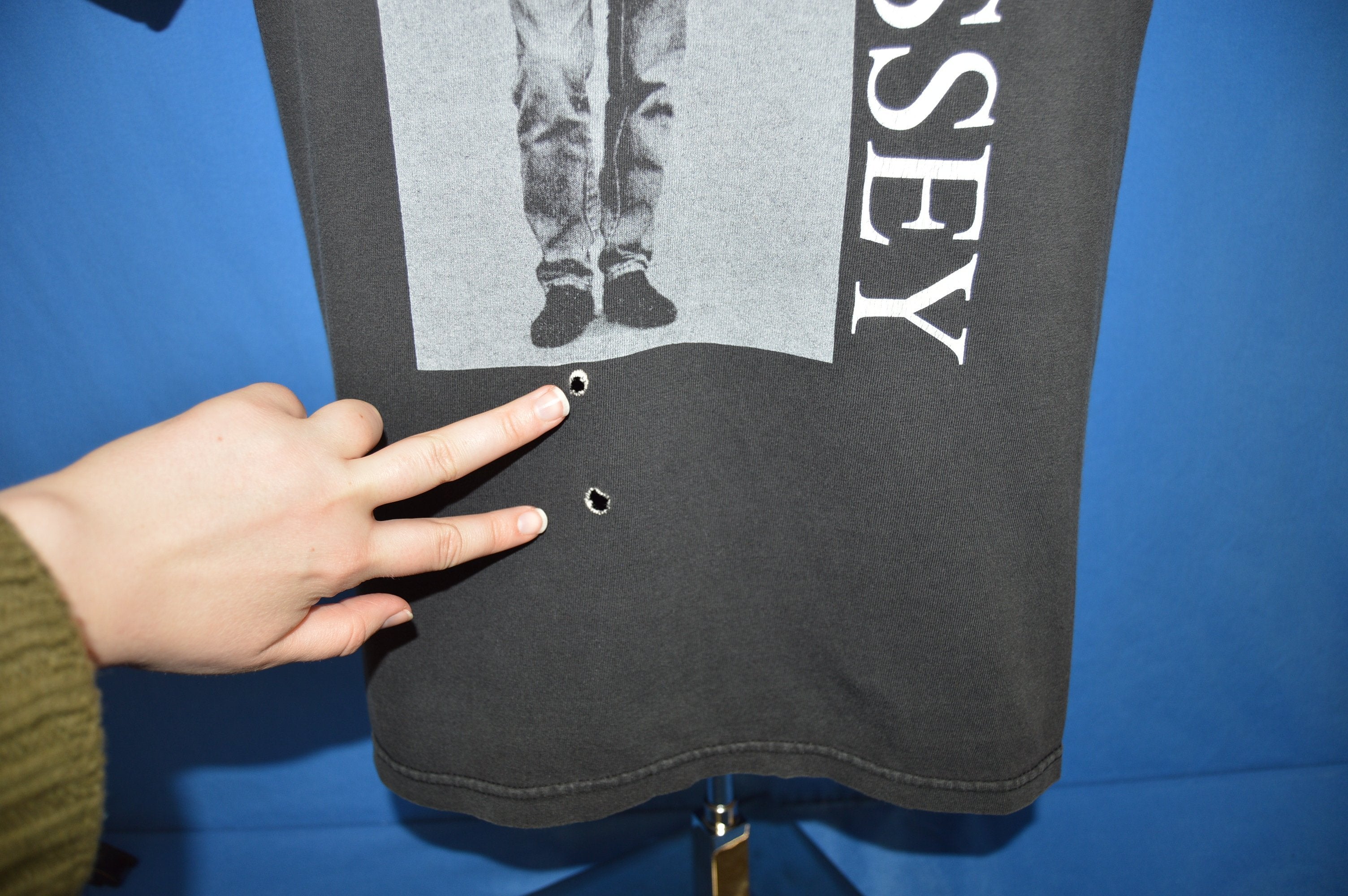 There are two holes on the front bottom and the shirt is slightly faded, but it is in otherwise excellent condition. See pics.