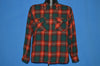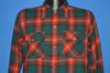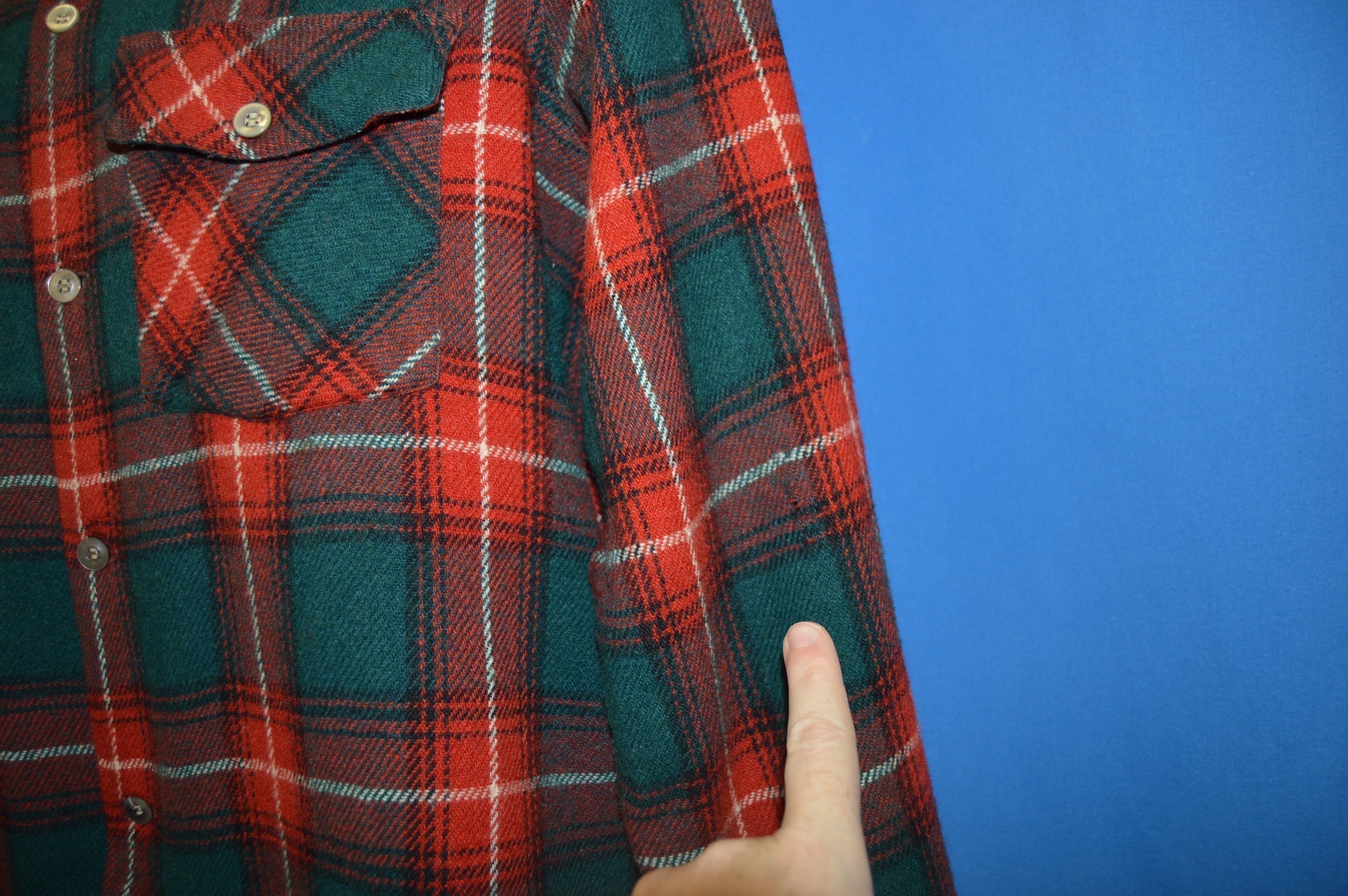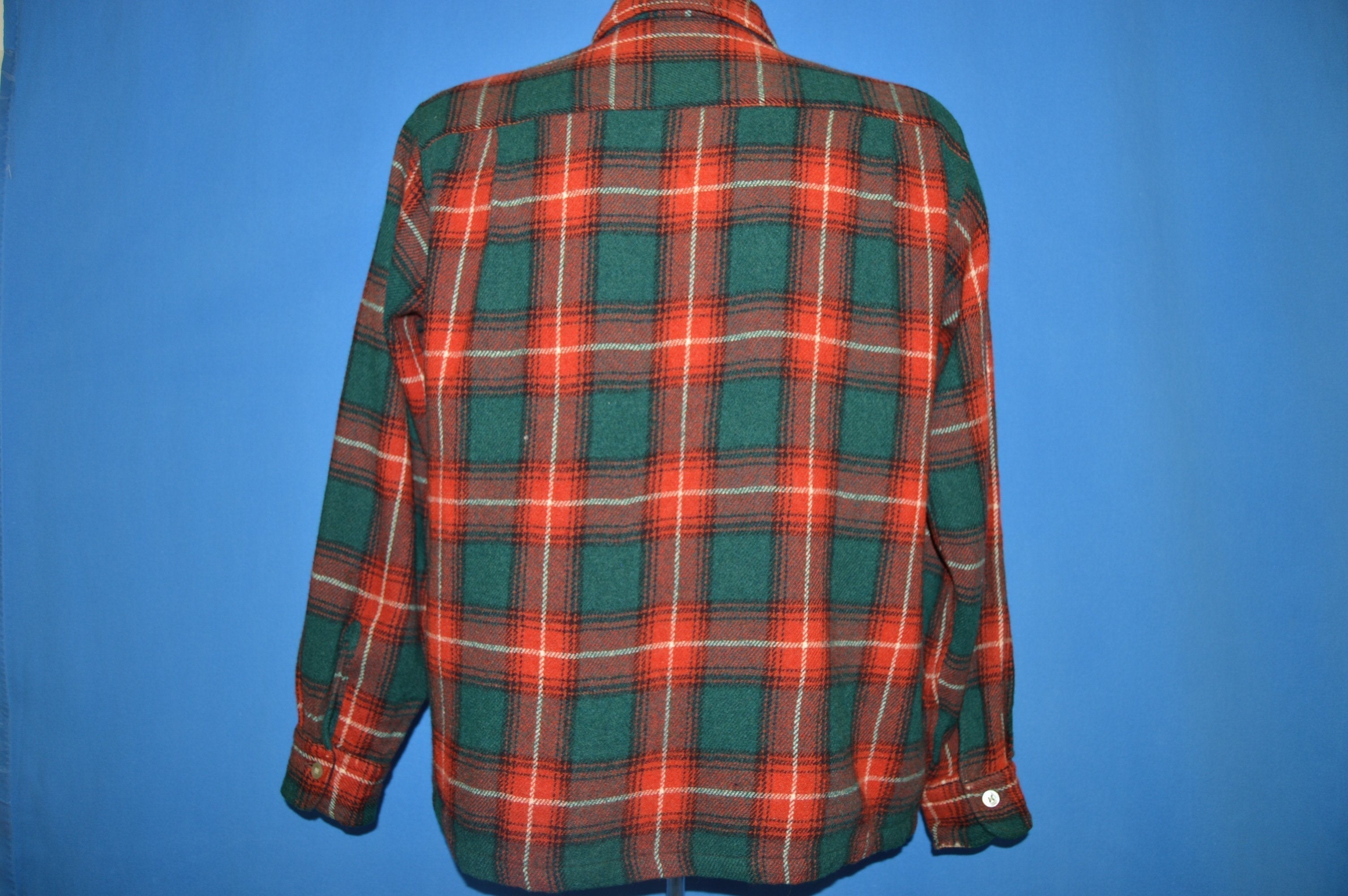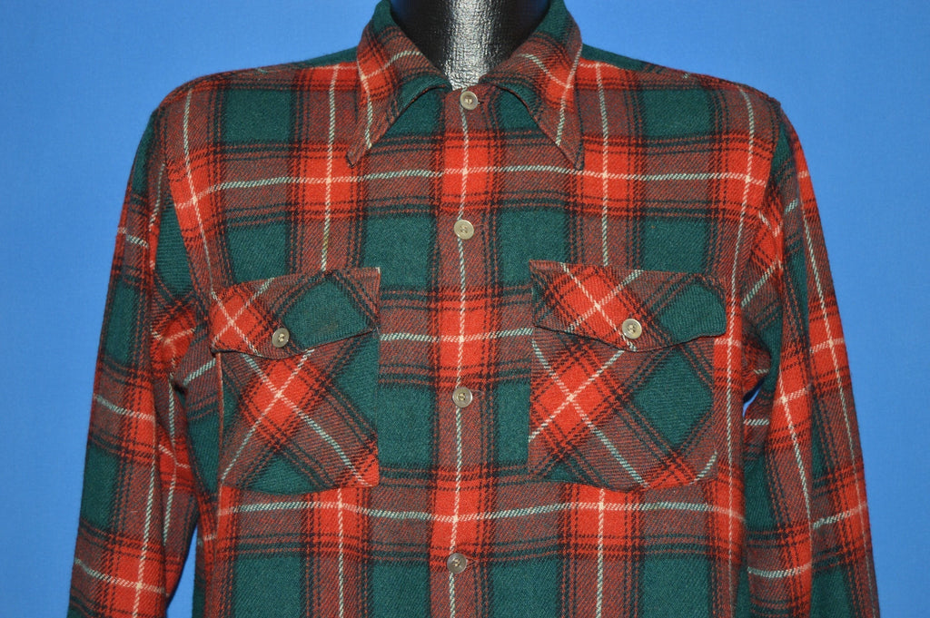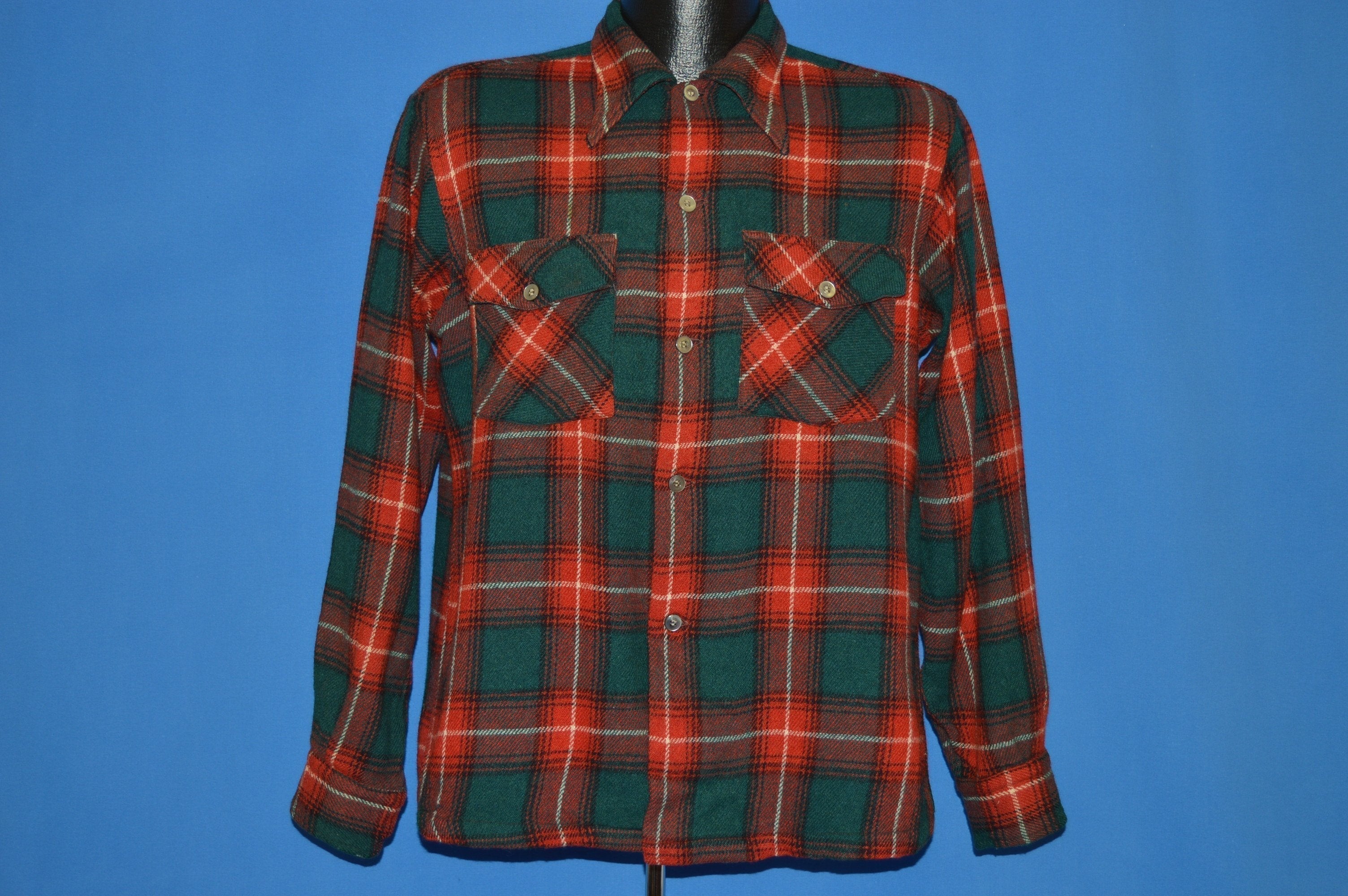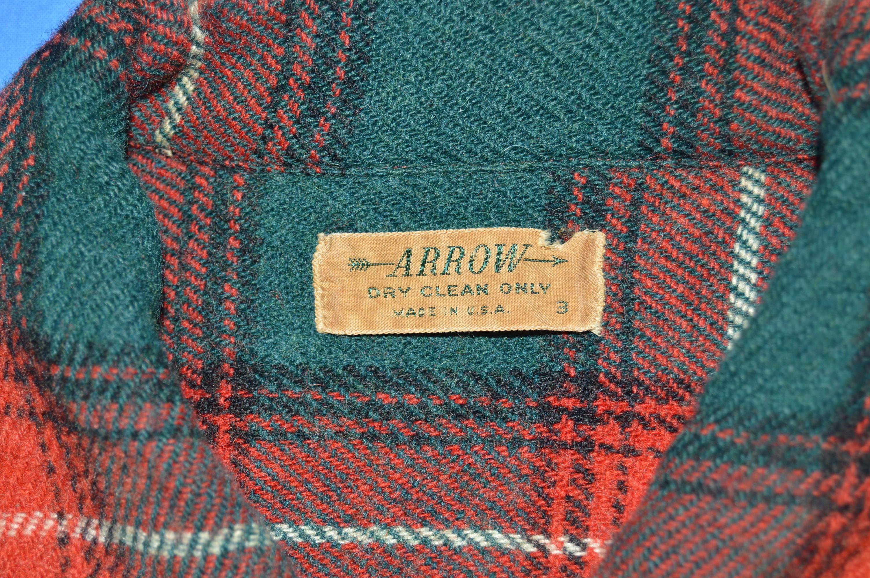 This red and green tartan plaid wool shirt is from the brand Arrow in 1940s. There are button flap breast pockets and button closures down the front. The shirt has a square bottom.