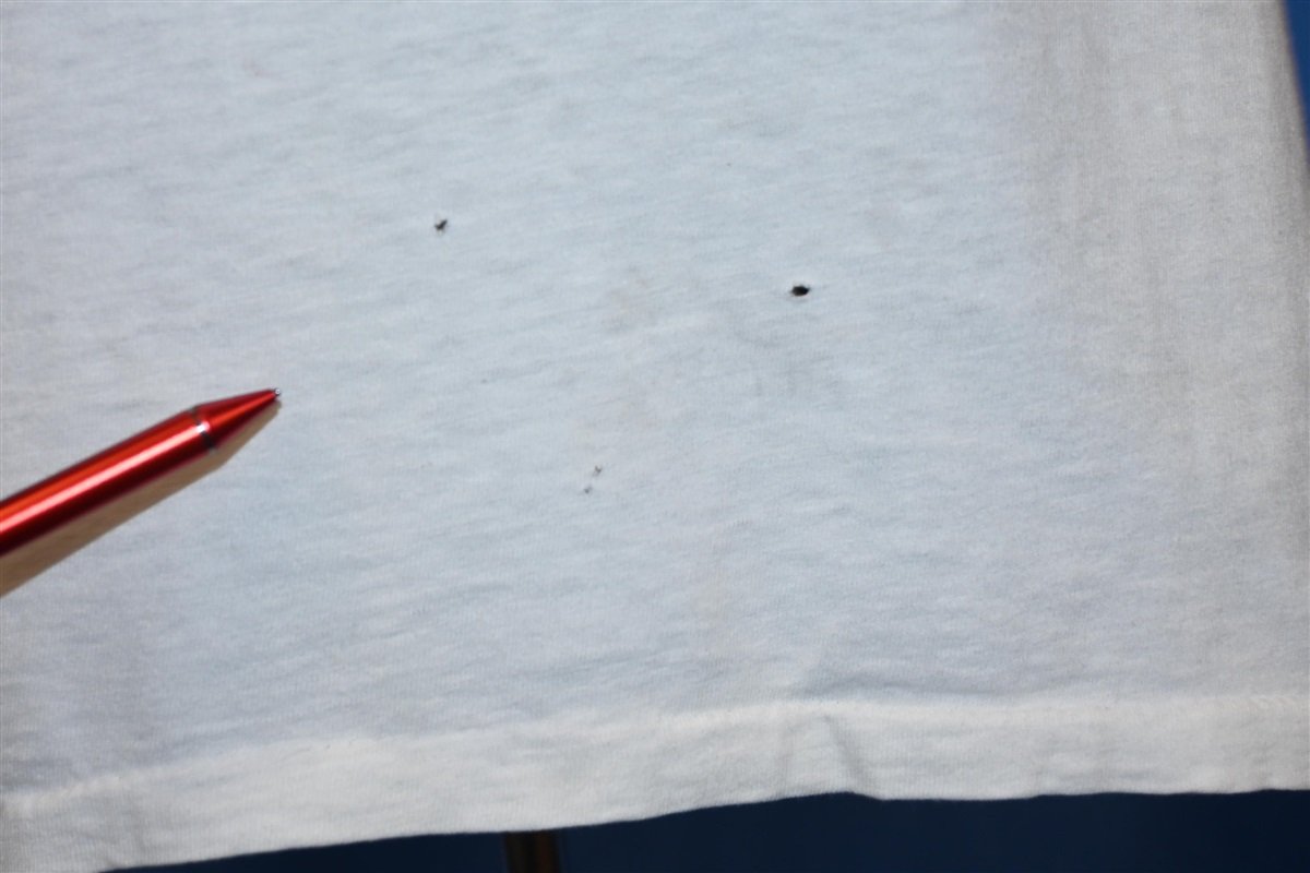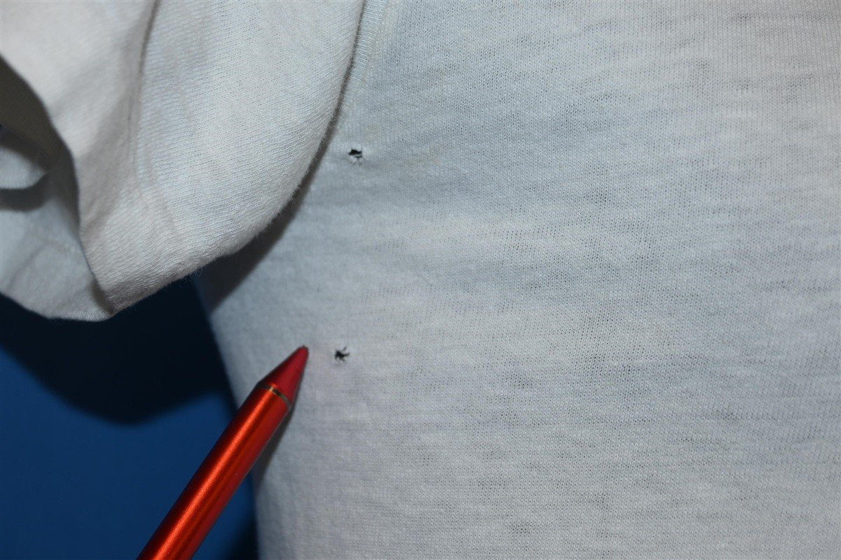 Fits like a modern unisex youth extra large. This shirt is soft and distressed with small holes and spots throughout, see pics.