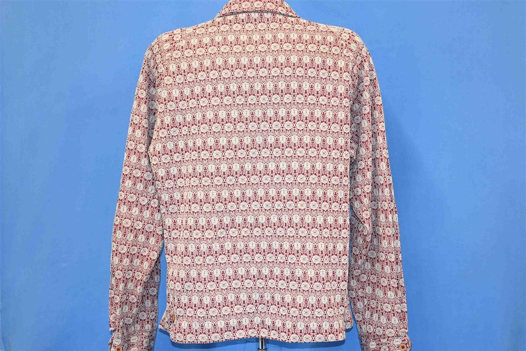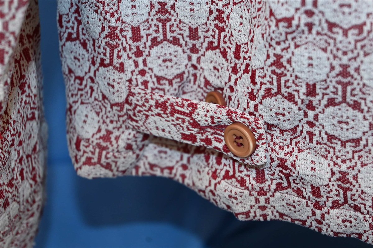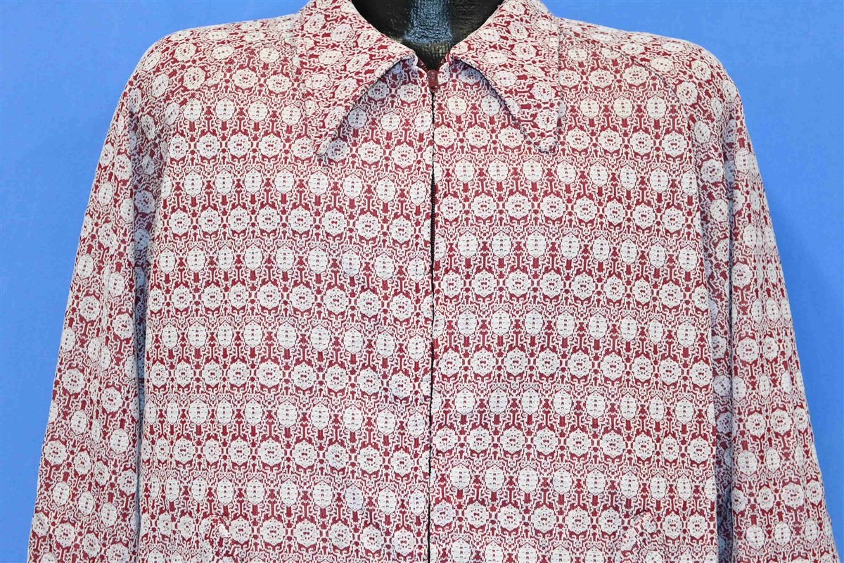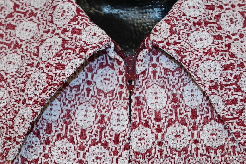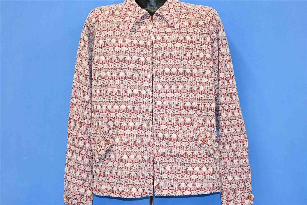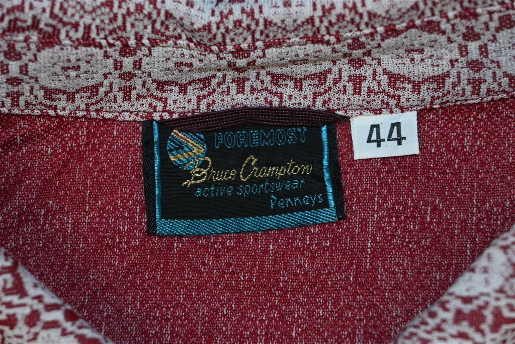 This stylish vintage jacket was made back in the 70s by Penney's, and it was part of a special line of golf apparel and equipment that was branded in collaboration with the Australian professional golfer, Bruce Crampton. This light jacket is perfect for providing some extra warmth out on the green, and it features a zipper closure and two button flapped pockets. The jacket is also made out of a beautiful jacquard material that features an intricate red and white pattern.