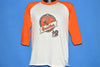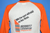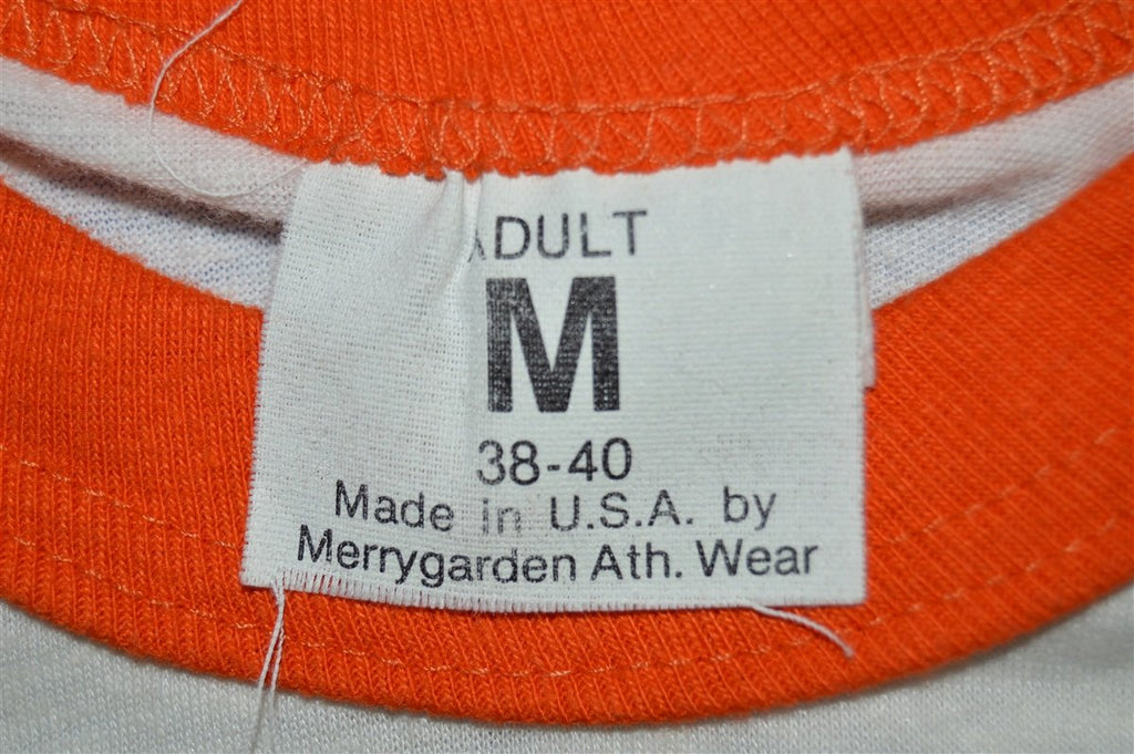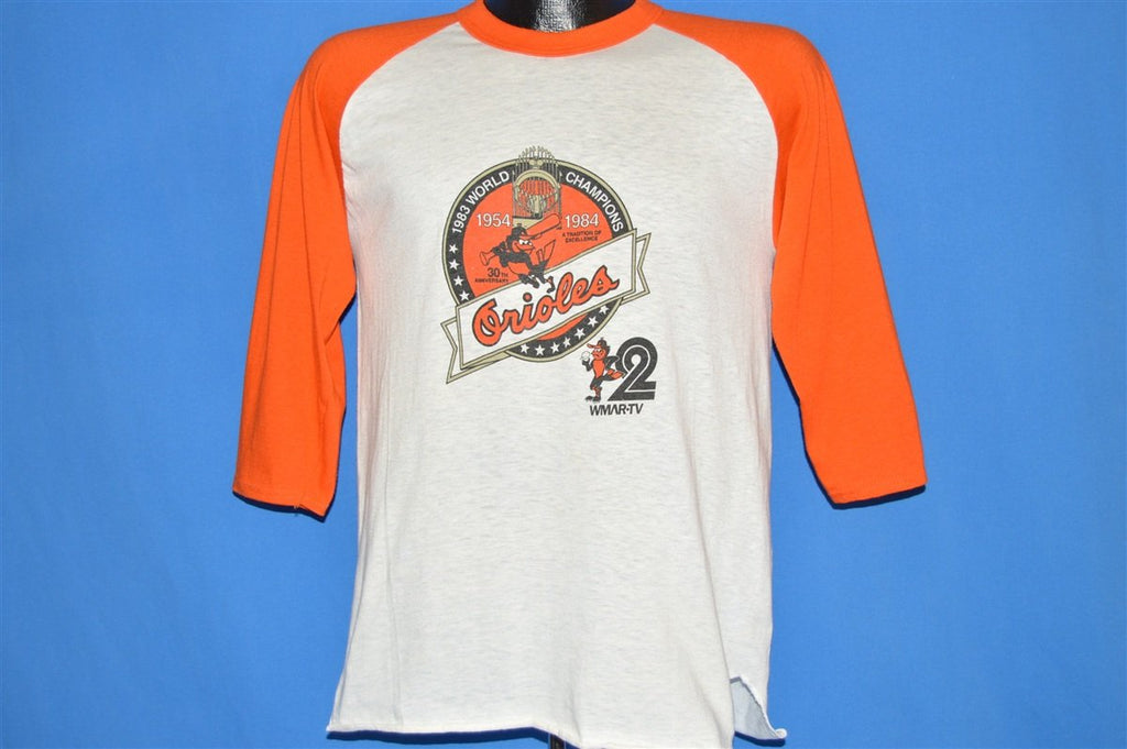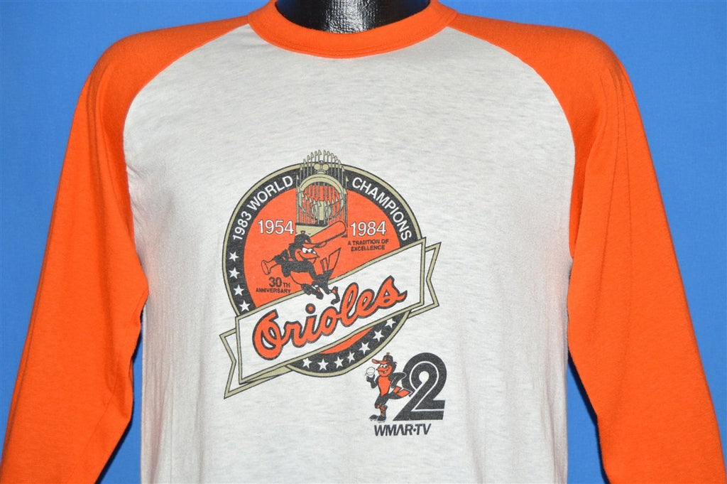 This shirt commemorates the Baltimore Orioles' 1983 World Series win. They beat the Philadelphia Phillies 4-1. On the back, it says "We're not afraid to be first", and there is the Merritt company logo. This raglan shirt has orange sleeves.