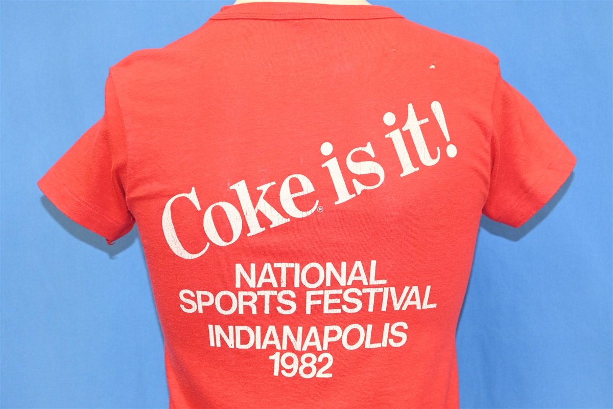 This cool vintage shirt was made to commemorate the 1982 National Sports Festival that took place in Indianapolis. This was the festival's fourth year, and it would later come to be known as the US Olympic Festival. The idea behind the event was to showcase athletes on a national scale during non-Olympic years. The event was organized with the help of the Los Angeles Olympic Committee and sponsored by Coca-Cola, and the back of this tee features the company's slogan "Coke Is It!"