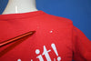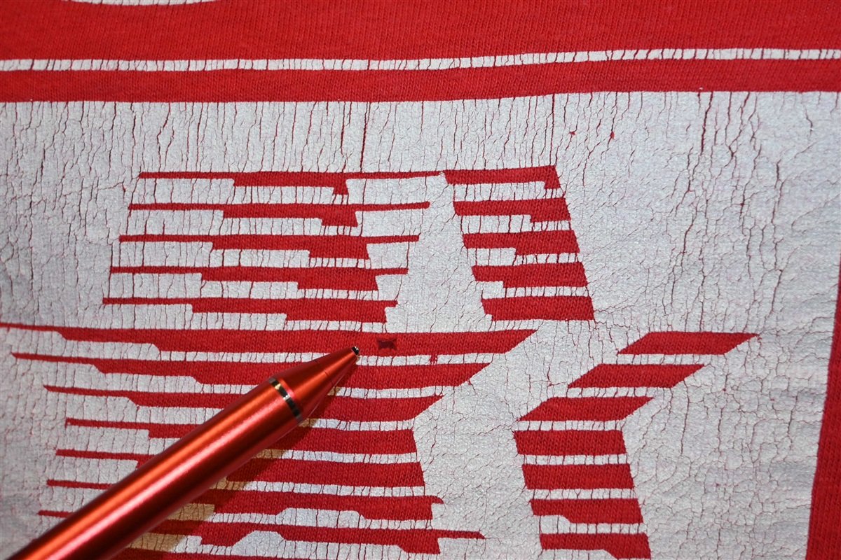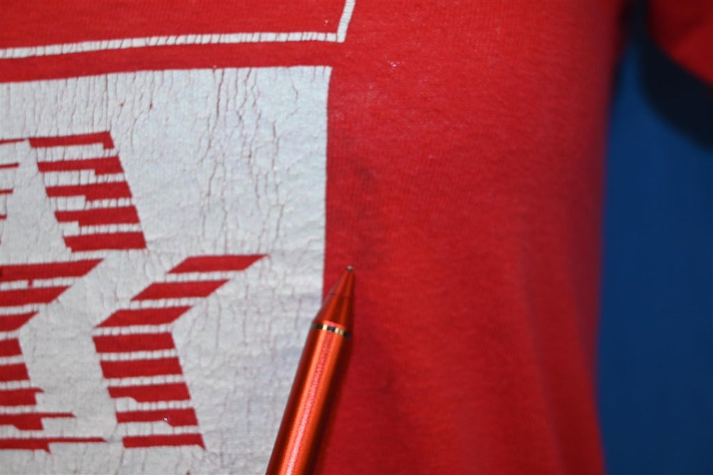 Fits like a modern unisex youth large. There is a hole in the front graphic and spots on both the front and back, see pics.