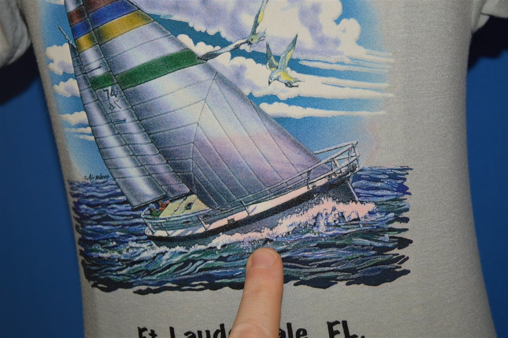 This gray toddler shirt has a graphic on the front of a sailboat on the ocean. Underneath, it says "Ft Lauderdale, FL". Ft Lauderdale is located on Florida's southeastern coast, and is known for its beaches and boating canals.