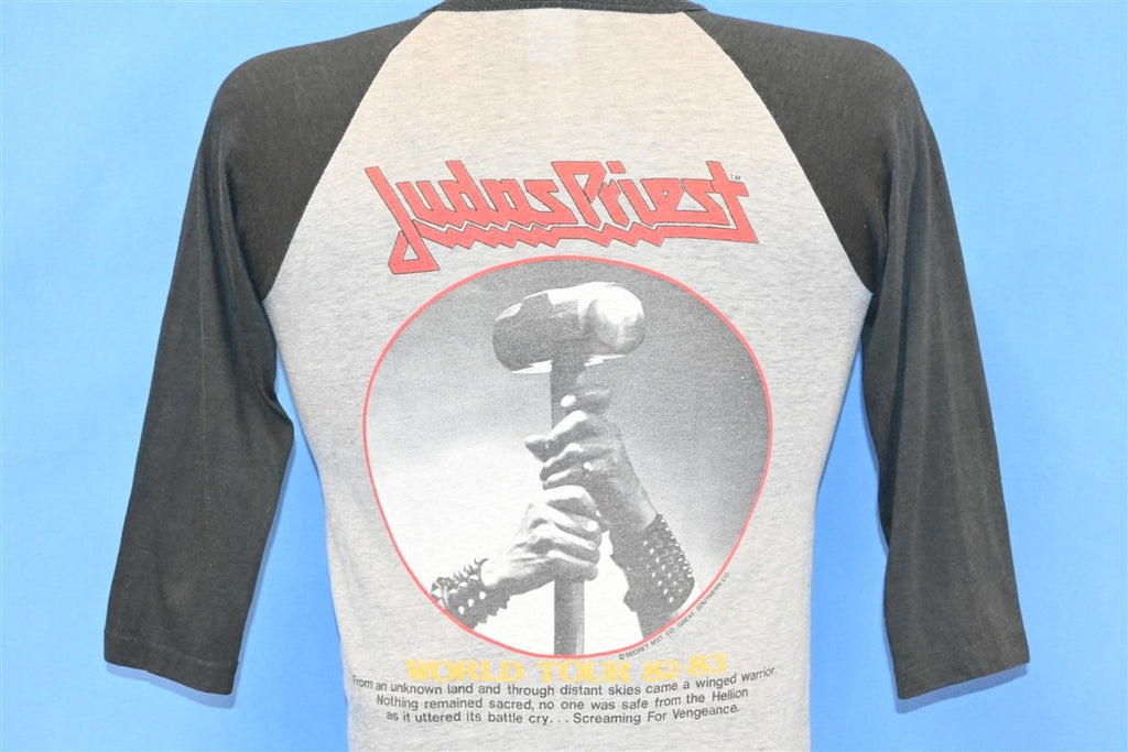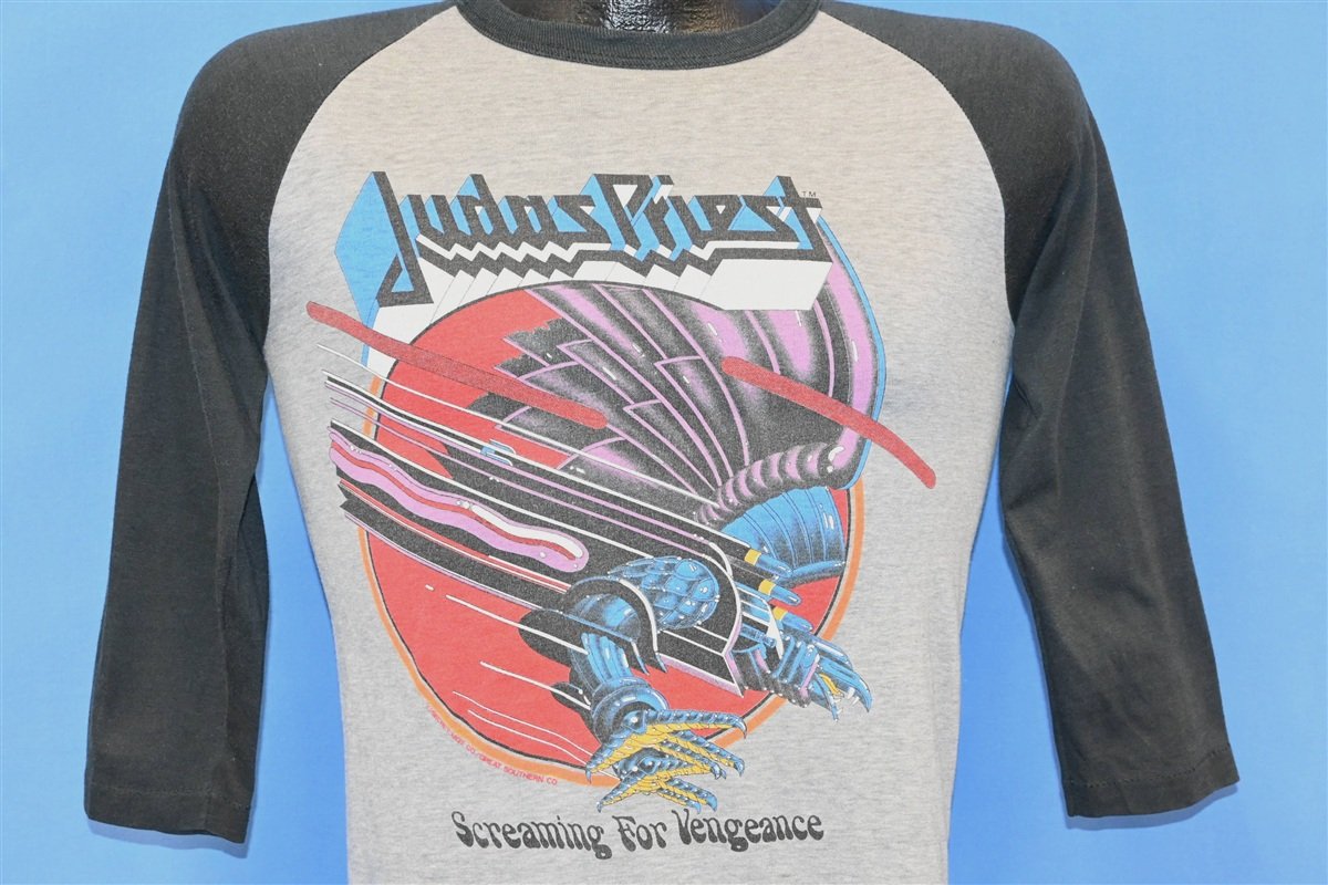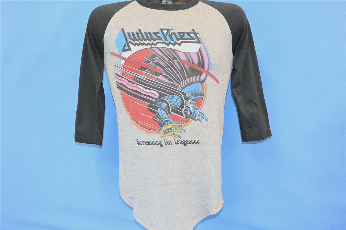 This awesome vintage raglan celebrates the Screaming for Vengeance World Tour from the English heavy metal band, Judas Priest. This tour was designed to promote the band's eighth studio album of the same name, and this tee features the record's sweet cover art, designed by Doug Johnson. Screaming for Vengeance went double platinum in the US, marking the band's commercial breakthrough in the States. The album spawned one of their most memorable singles, "You've Got Another Thing Comin'", as well as the songs "Electric Eye" and "(Take These) Chains".