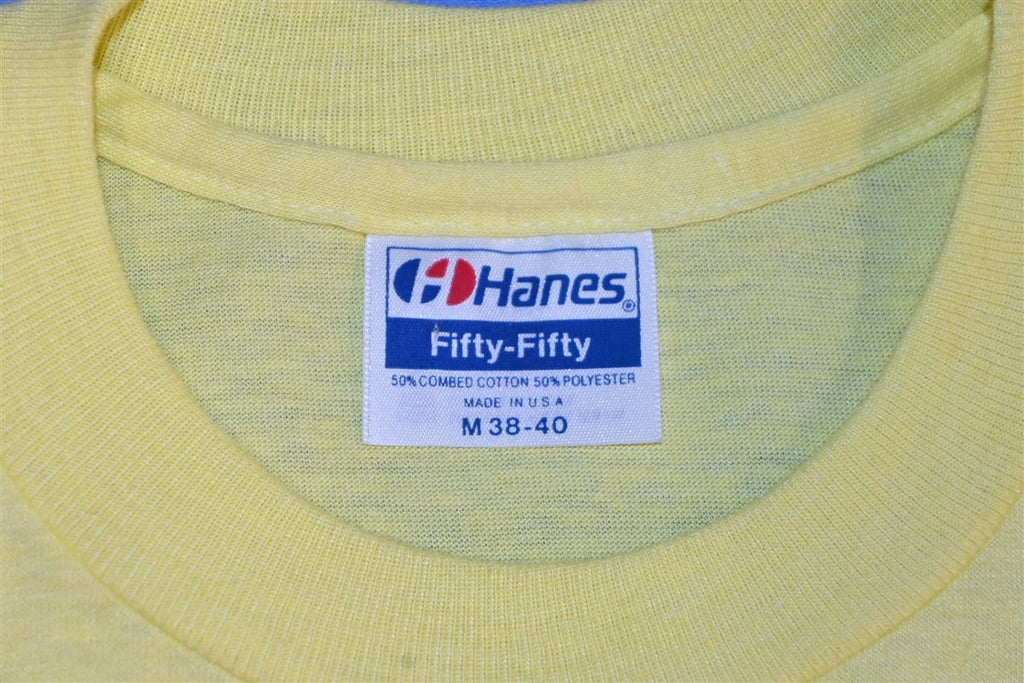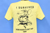 This cool double sided tee commemorates a trip taken by the Los Padres Ski Club in 1989. The Los Padres Ski Club was originally formed in 1937 to bring together people interested in the budding sport of downhill skiing. Over time the club grew into a community group for outdoor enthusiasts, and they began planning activities that extended beyond skiing. One of these activities was a river float trip down the Kern River and the back of this tee celebrates the outing with a cartoon river rat and the declaration, "I survived".
