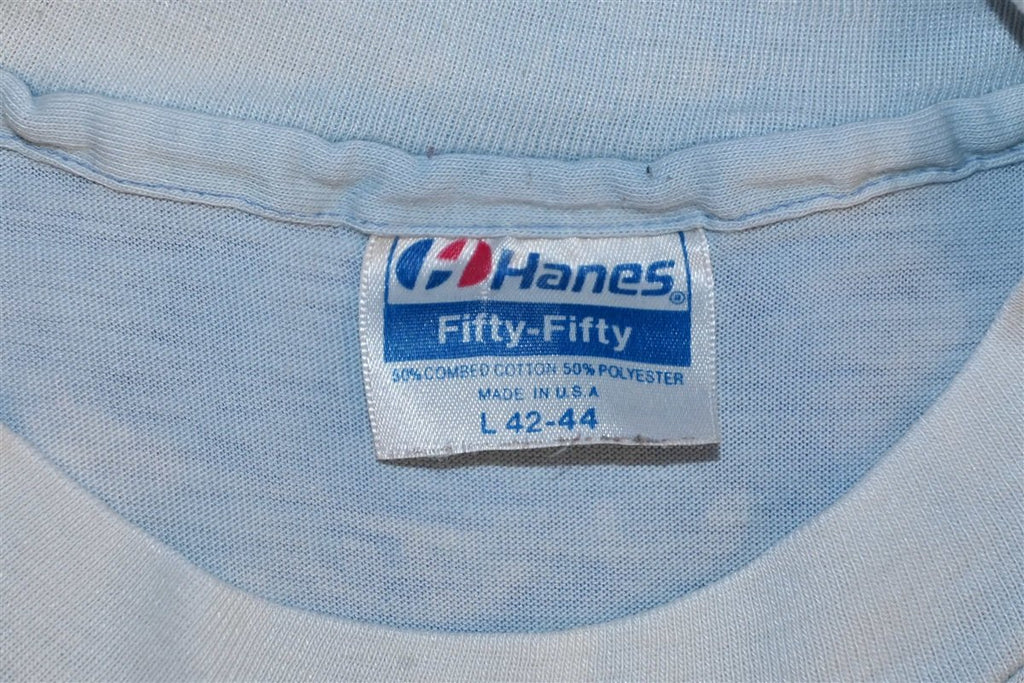 Fits like a modern unisex adult medium. This shirt is soft and thin with some light spots, see pics.