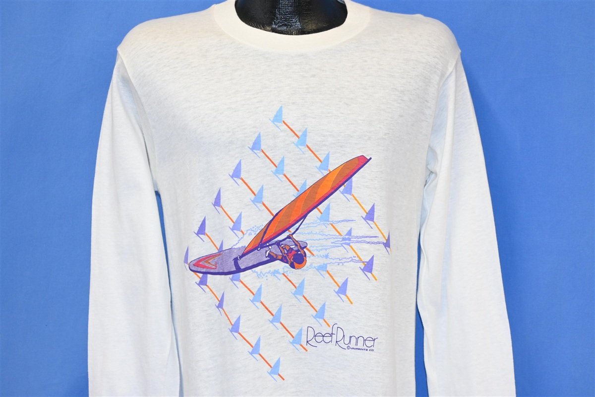 This cool vintage shirt was made in the 80s, by a surf apparel company called Reef Runner. This cotton tee features long sleeves and a sweet graphic of a windsurfer riding a wave. The sport of windsurfing really took off during the 80s, and it was even added to the Olympics before the end of the decade.