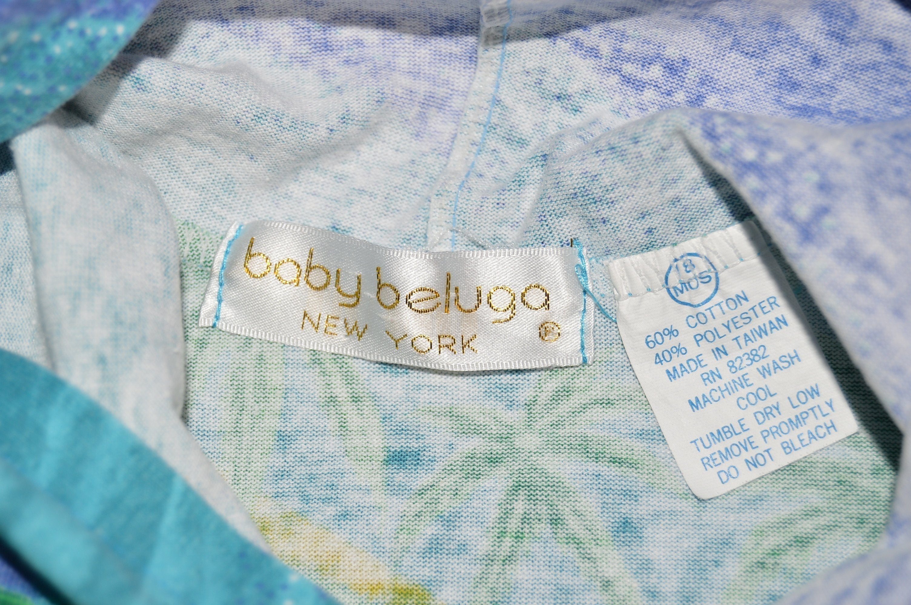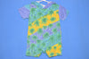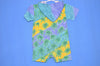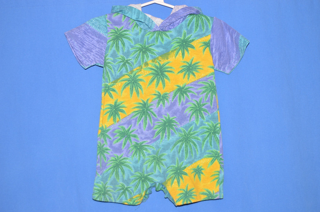 This adorable romper has palm trees printed over purple, blue and yellow diagonal stripes. It has a hood and short sleeves and legs with snaps in the crotch for easy diaper changes.
