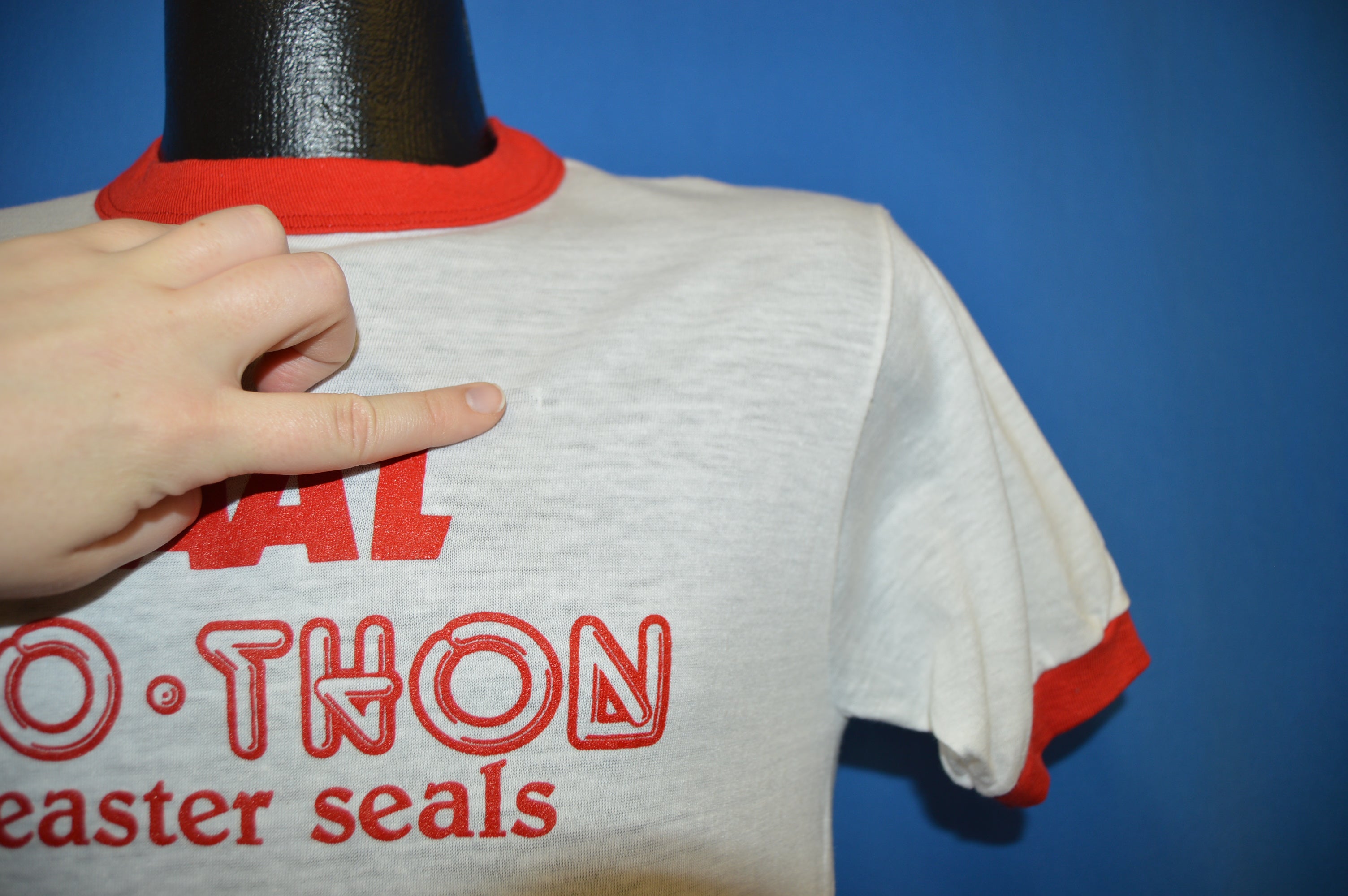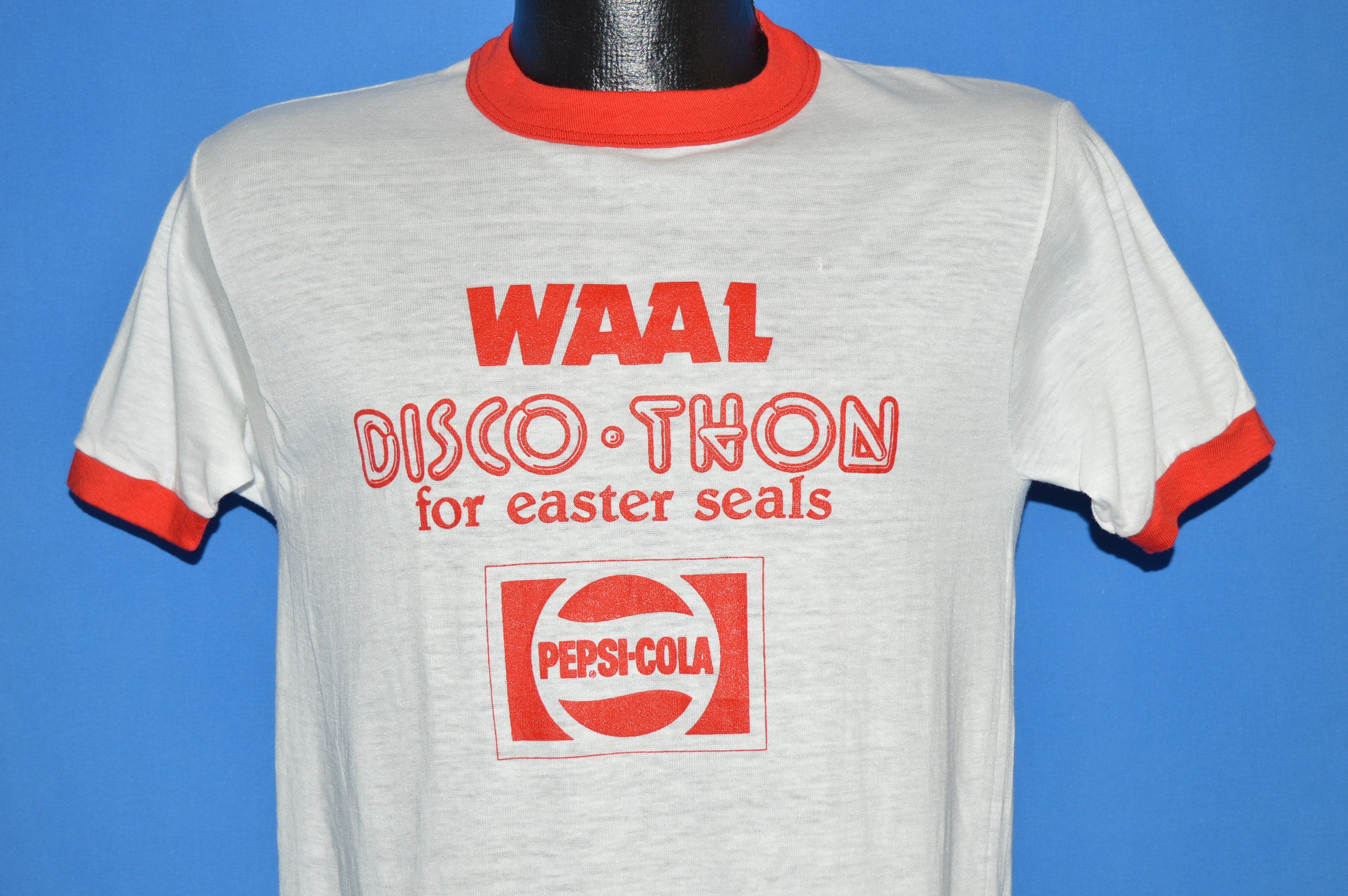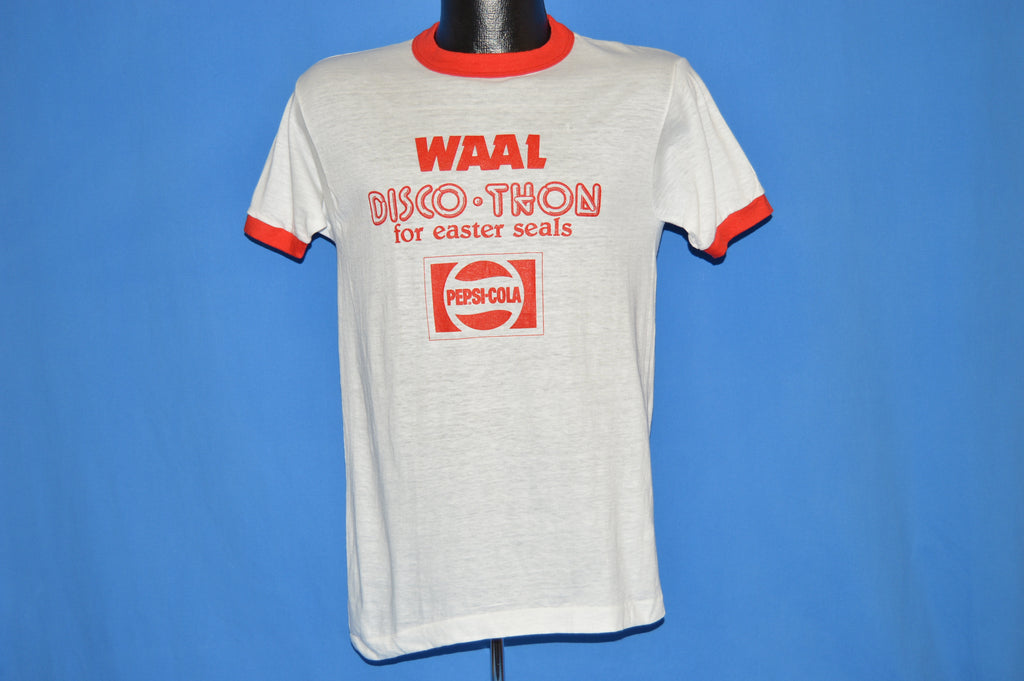 This shirt is from the 80s and features a graphic on the front that says "Waal DiscoThon for Easter Seals". Underneath, there is the PepsiCola logo.