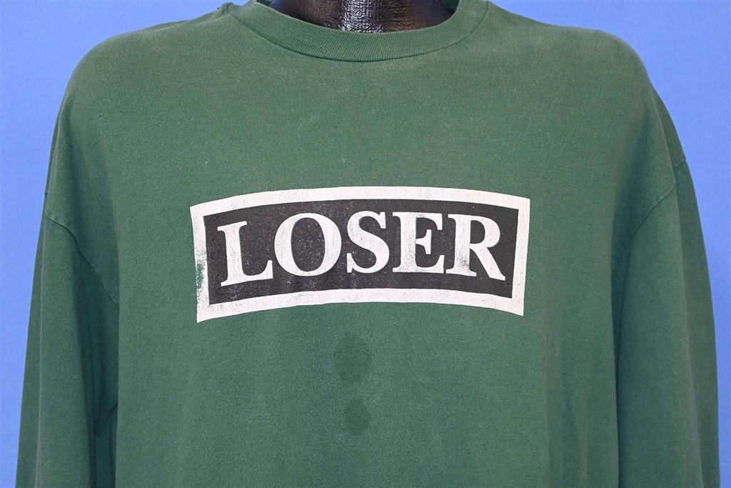 This cool vintage tee was made by a former streetwear brand known as Phuc Clothing. There's not a lot of information surrounding Phuc, aside from them being popular among the 90s skate crowd, but this shirt is a prime example of one of their classic designs. Some of Phuc's most popular tees involved simple, rectangular logos that featured ironic words or phrases. Examples include graphics that said, "poser", "I heart school" and "jesus hates me", as well as this shirt, which simply reads, "loser".