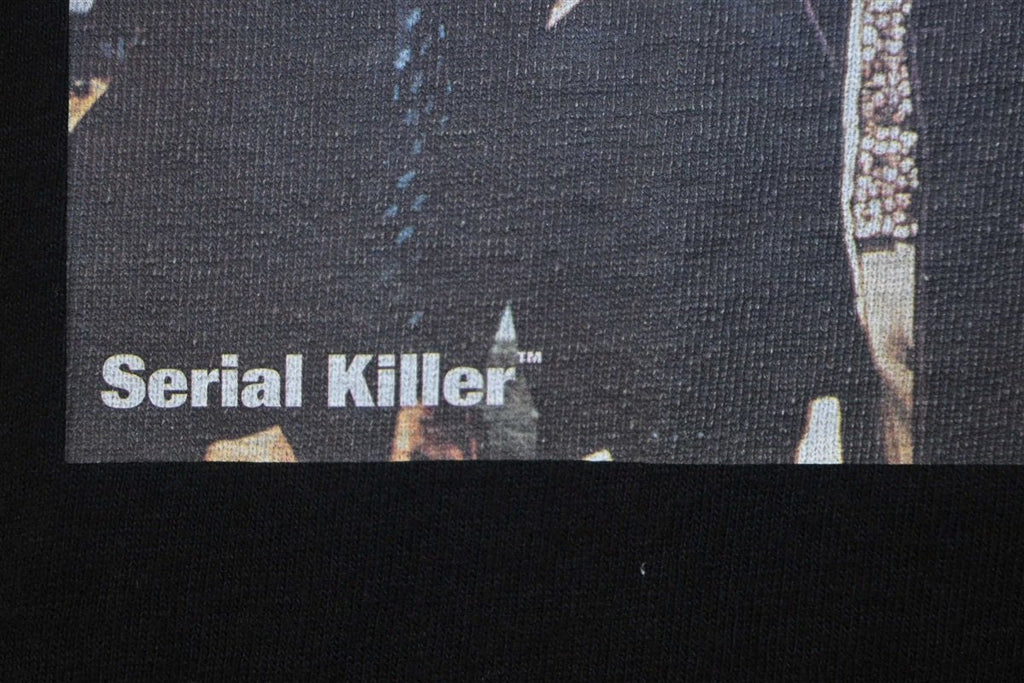 This cool tee is from the celebrated 90s streetwear brand, Serial Killer. The brand was a favorite among many alternative kids of era, and they were known for pairing mainstream movie and TV graphics with racy words and phrases. This shirt is a classic example of a typical Serial Killer tee, as it features a still from the beloved 1971 film Willy Wonka & the Chocolate Factory, but with the word "drugs" imposed over the shot.