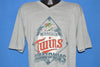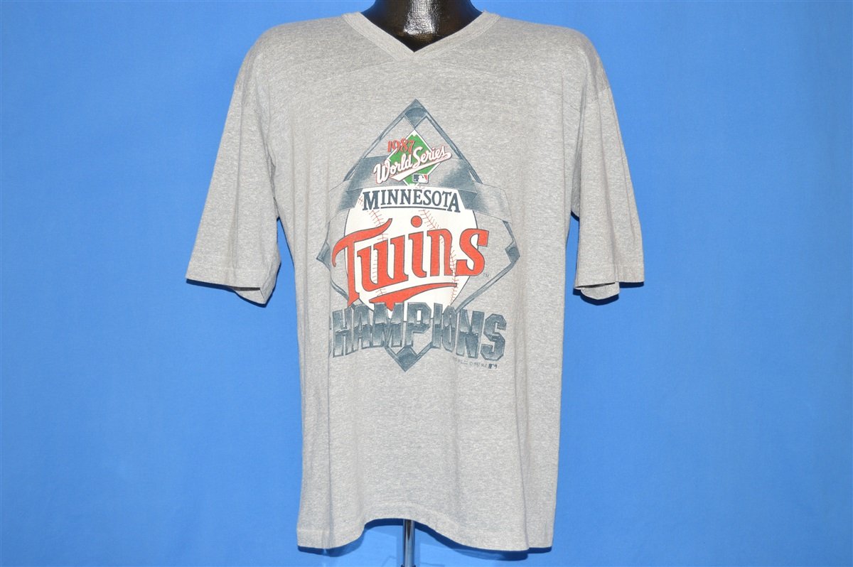 This t-shirt is from the Minnesota Twins' MLB Championship win in 1987. This was the baseball team's second World Series title overall, but their first win after changed their name from the Washington Senators. The Twins defeated the St. Louis Cardinals four games to three to win the 87 World Series and Pitcher Frank Viola was named the MVP.