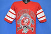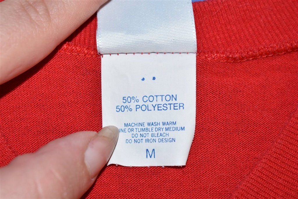 This shirt fits like a modern unisex adult Medium. There is a repair, several spots, and holes on the back of the sleeve, see pics.