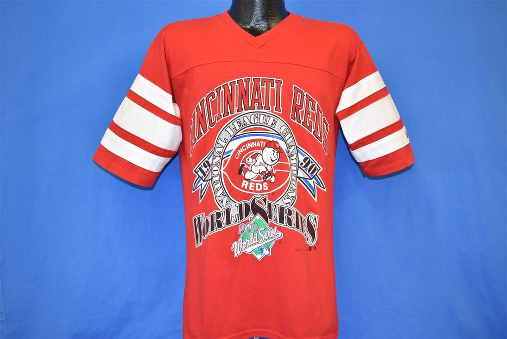 This v-neck tee celebrates the professional baseball team the Cincinnati Reds and their win of the 1990 World Series. The Reds faced off against the American League champions the Oakland Athletics. The Reds won in a four-game sweep, and many fans will remember Reds outfielder, Billy Thatcher's seven consecutive hits. Pitcher, Jose Rijo would be named the series MVP, and this win extended the Cincinnati's Reds Series winning streak to a total of nine wins since 1975.