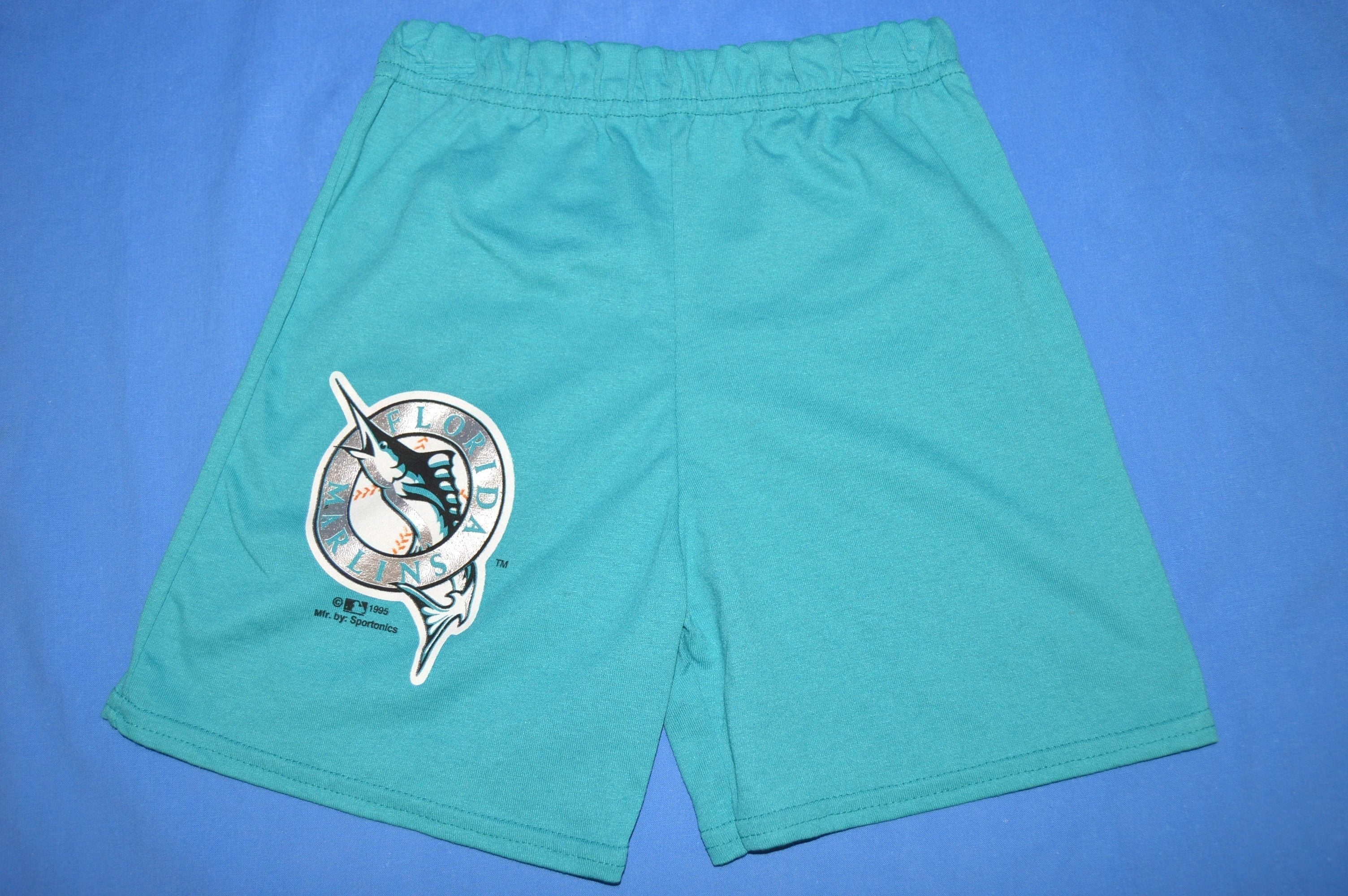 These teal kid's shorts are from the MLB baseball team the Florida Marlins in the 1990s. The shorts have the team's name and colors, as well as the team's former logo used from 1993 to 2011 before the team was re-branded and re-named the Miami Marlins.
