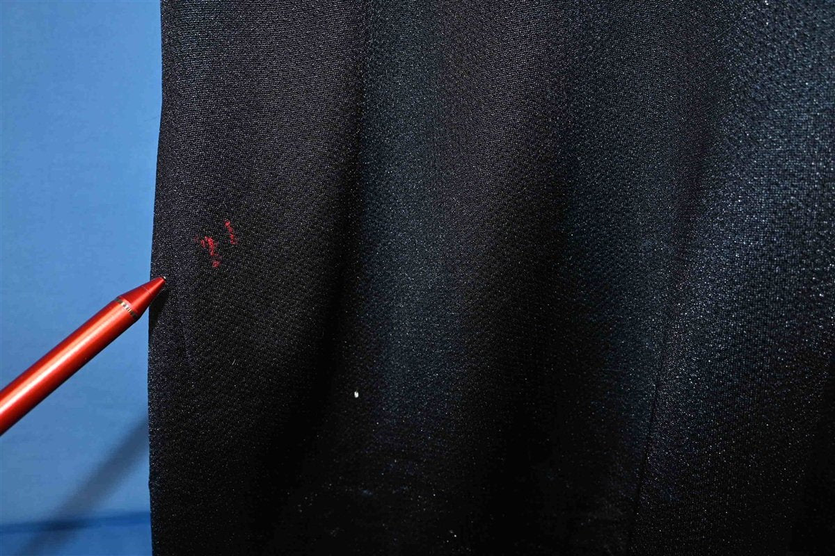 Fits like a modern unisex adult XXl or 2XL. There are some spots on the front and a run on the back, see pics.