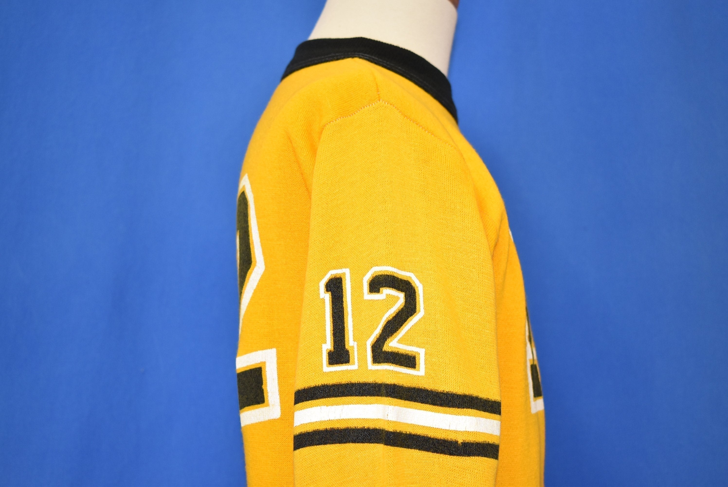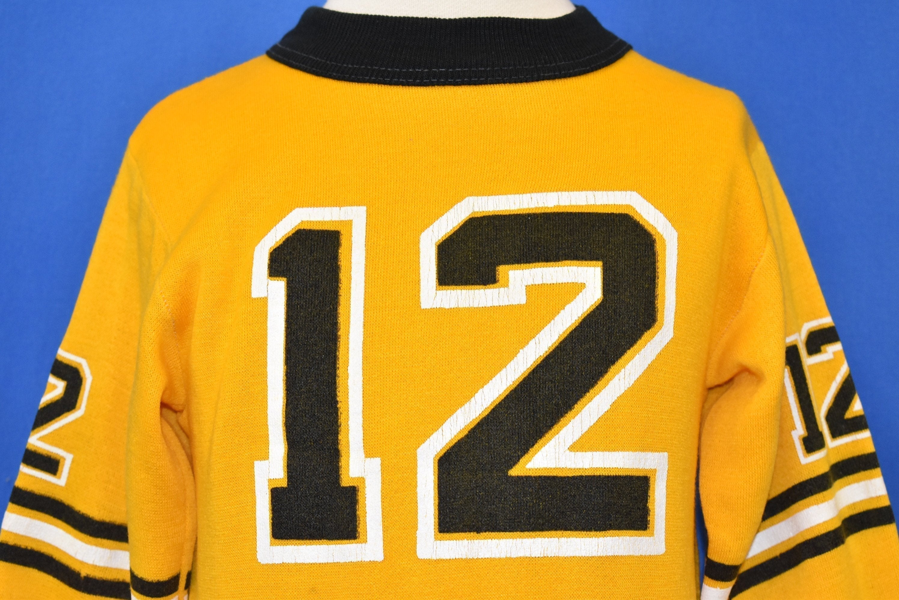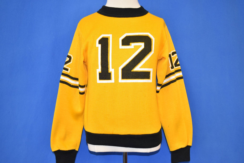 This youth size acrylic sweatshirt has the number 12 on the front, back, and sleeves. There are black and yellow stripes on the sleeves. The sleeve cuffs and collar are also black.
