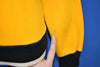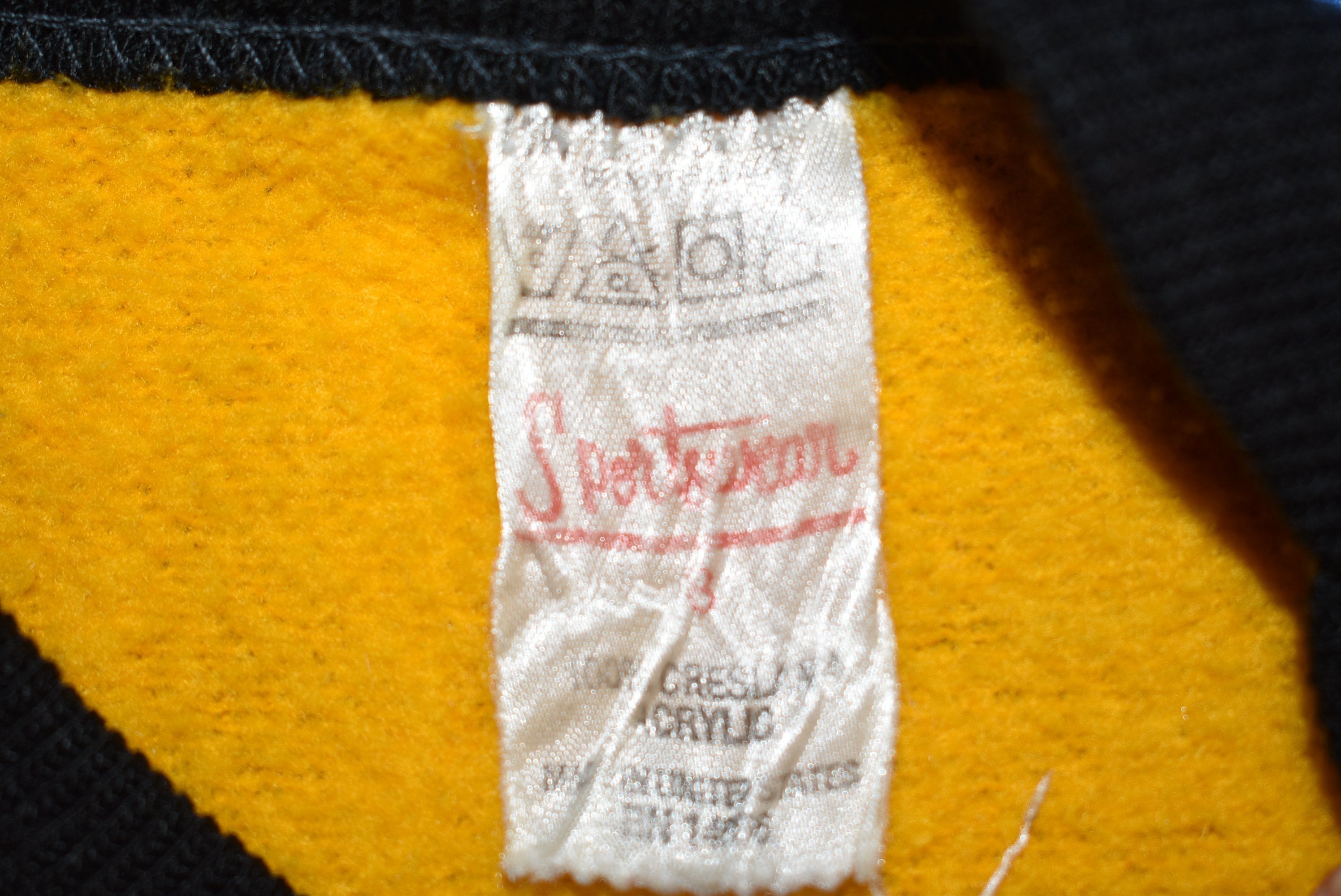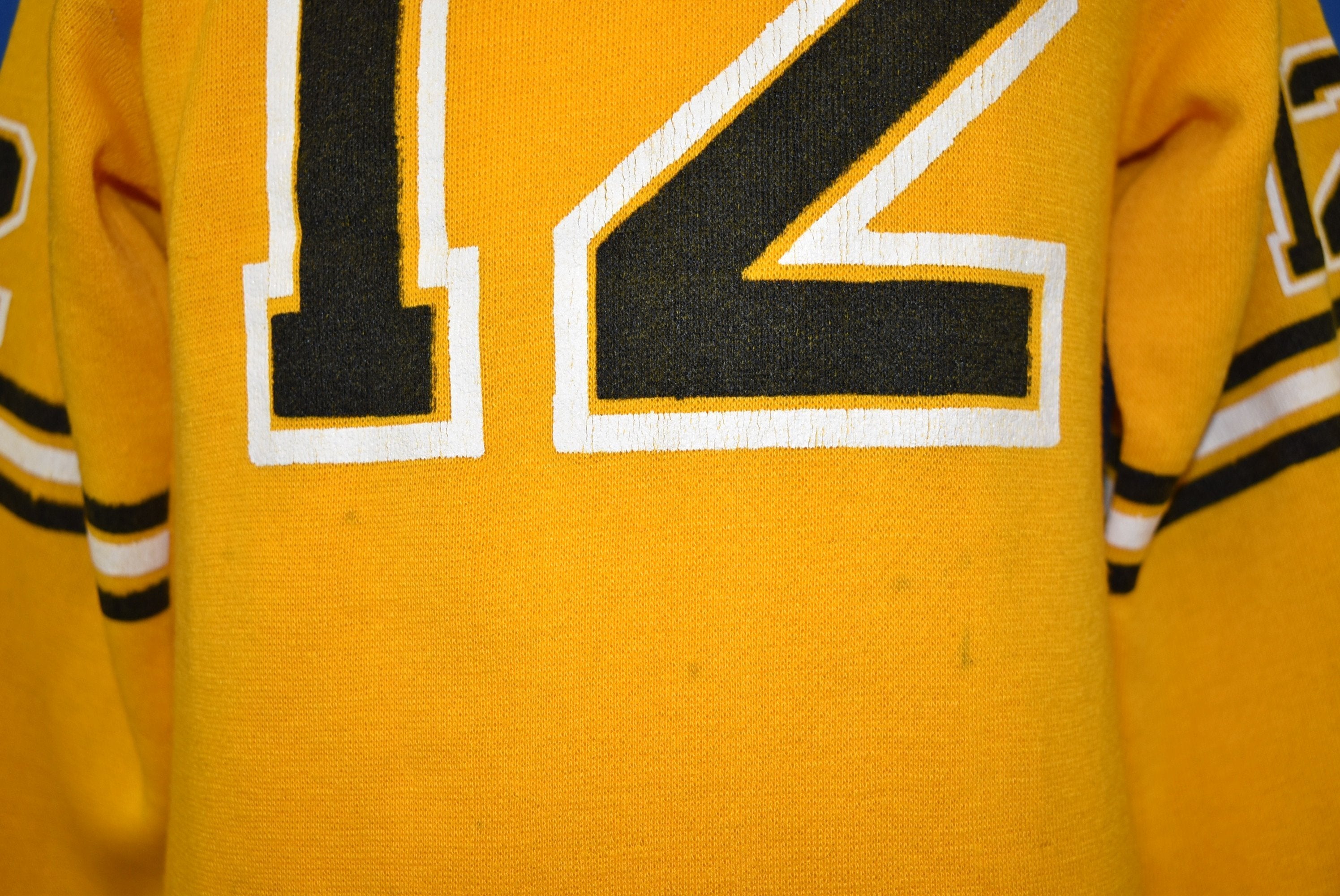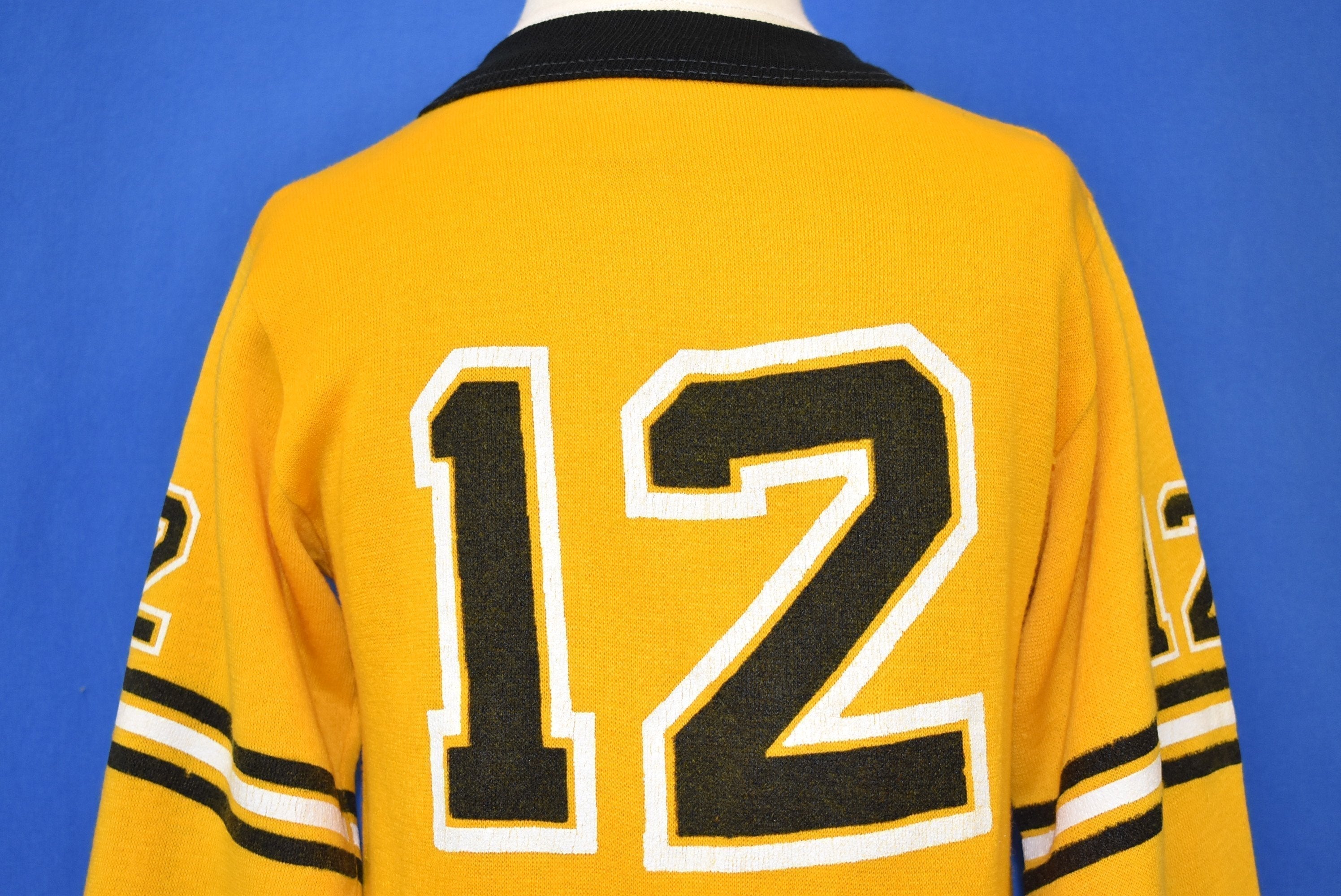 This youth size acrylic sweatshirt has the number 12 on the front, back, and sleeves. There are black and yellow stripes on the sleeves. The sleeve cuffs and collar are also black.