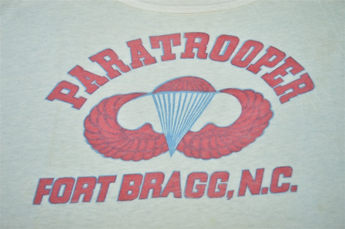 This rare shirt features a jump wings stencil design with "Paratrooper" and "Fort Bragg, N.C." in red, and is from the 1940s! Home of the 82nd Airborne, Ft Bragg is known for Paratrooper training, and this was the base that the main support Paratroopers that participated in the Normandy Invasion were stationed and trained. This shirt is either from late World War 2 or just after the war, and before the Korean conflict.