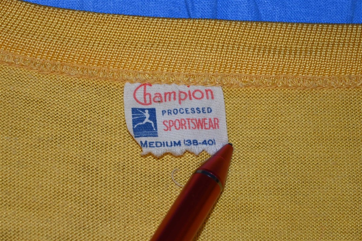 This incredible vintage shirt dates all the way back to the 1950s. This shirt is a vintage jersey made by the classic sportswear manufacturer Champion, and it features the company's famous running man tag. There's not a lot of information surrounding this jersey, but it's safe to assume it was likely made for a college or educational institution. Champion first began producing collegiate apparel in the 1930s, and they helped give birth to the market. They also have a long history of providing sports and physical education uniforms.