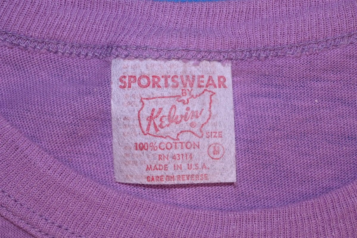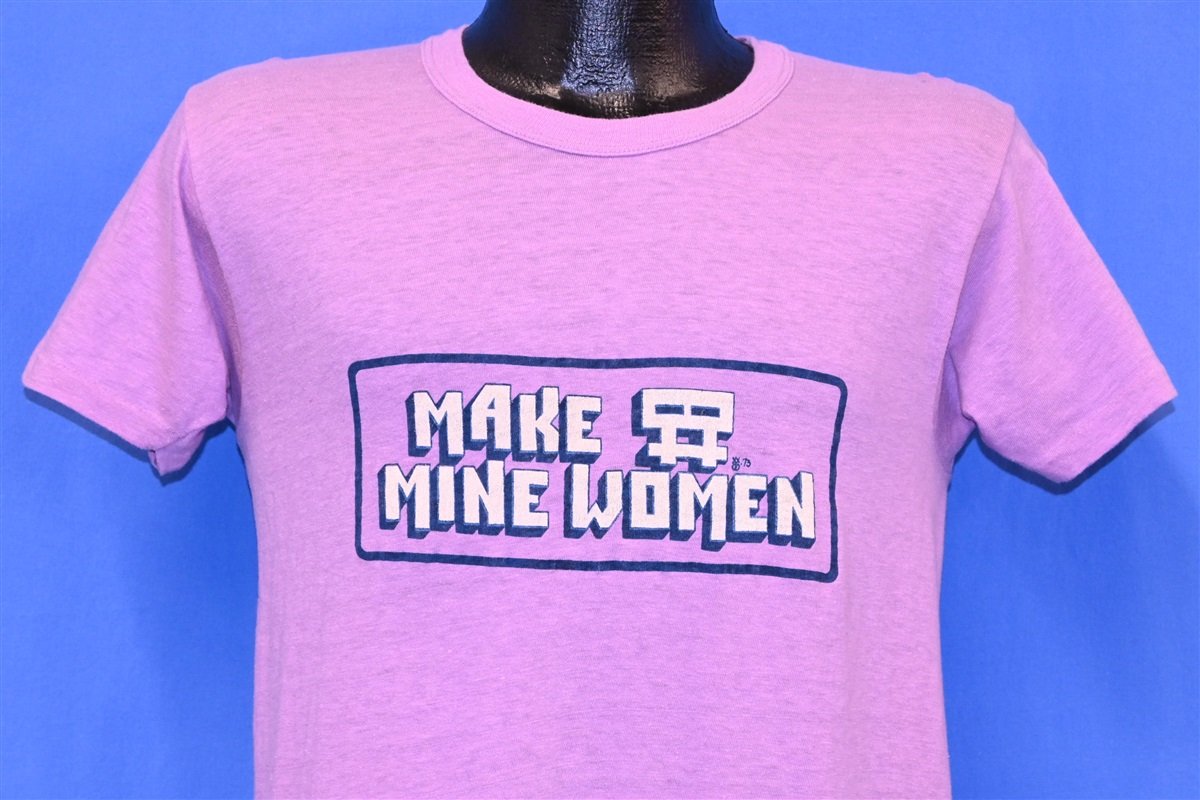 This light purple tee is an awesome souvenir from the 70s that reads "Make Mine Women", with an image of two Venus symbols. The Venus symbol has been used to represent the female gender since the mid 1700s, and this double variation is meant to represent Sapphic love or same sex attraction between women.
