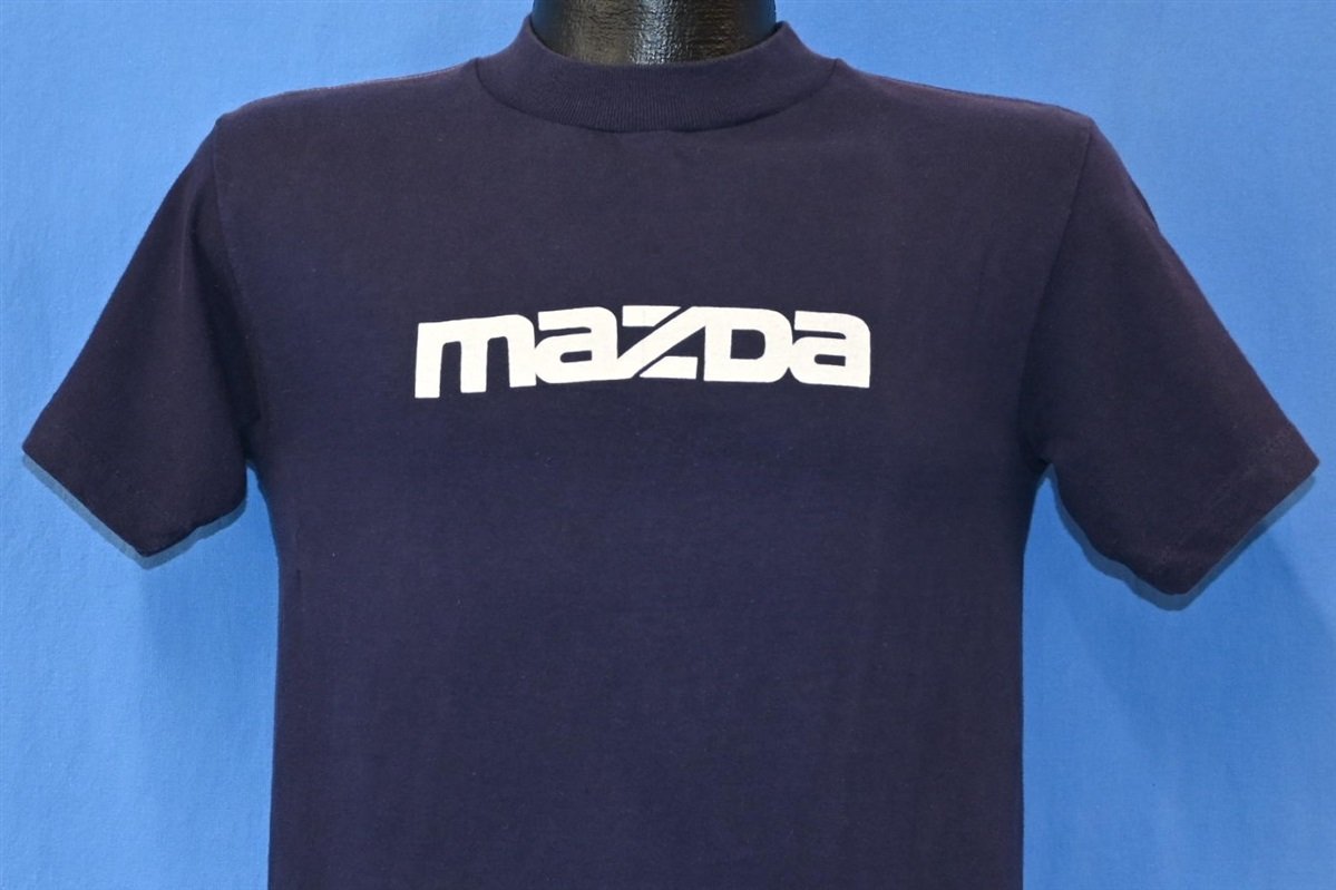 This rad graphic tee is for the Japanese car brand, Mazda. This logo was introduced by Mazda in 1975 and used until 1997. The company name is based on the Zoroastrian creator god, Ahura Mazda, and the founder's name, Jujiro Matsuda. Mazda started out by manufacturing auto rickshaws but they quickly moved on to selling cars. In the 60s, Mazda invented the Wankel engine, which is a type of internal combustion engine that uses a rotary design. Mazda's Wankel engine cars, like the Cosmo, have been very successful in automobile racing worldwide.