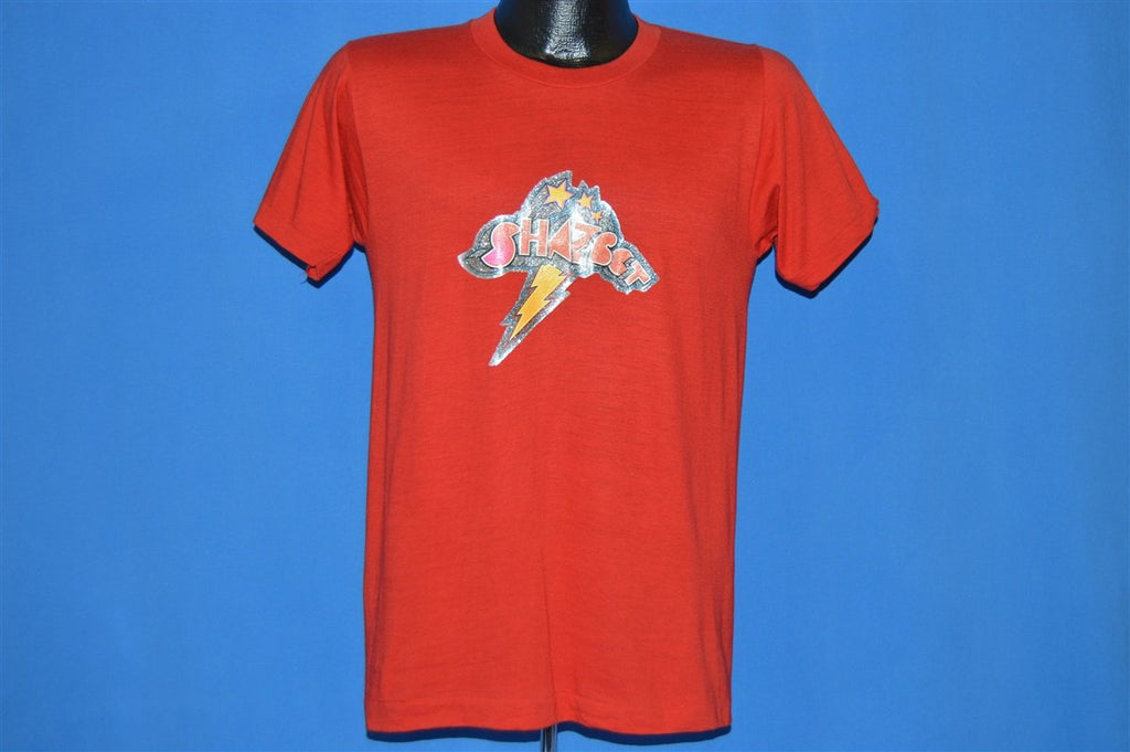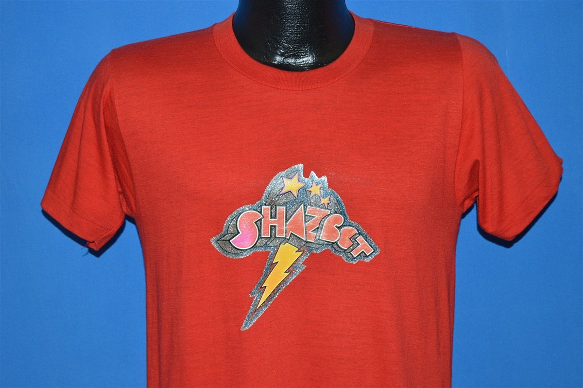 This red shirt is from the 70s and features an iron-on graphic for the TV show Mork & Mindy. The show first aired in 1978 and was a spin-off series of an episode of Happy Days featuring the late comedic actor Robin Williams. The shirt features an iron-on graphic of the character Mork's catchphrase "Shazbot" on the front.