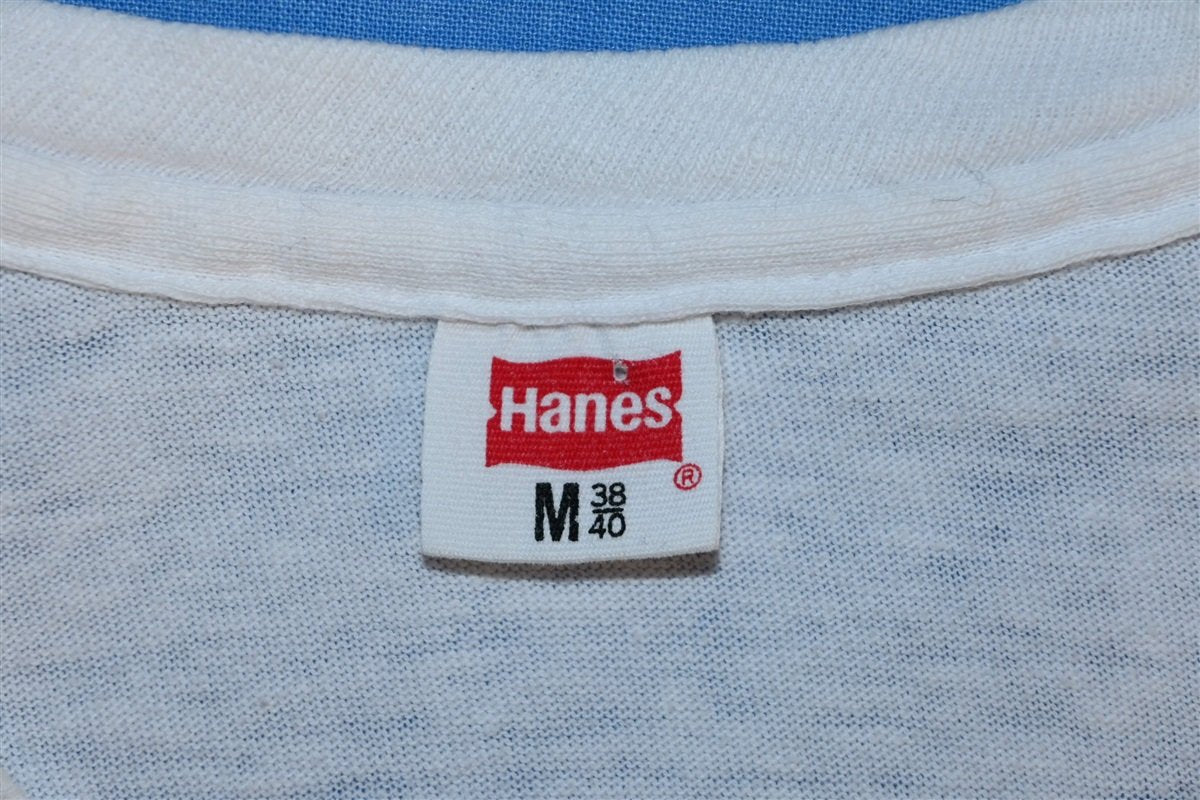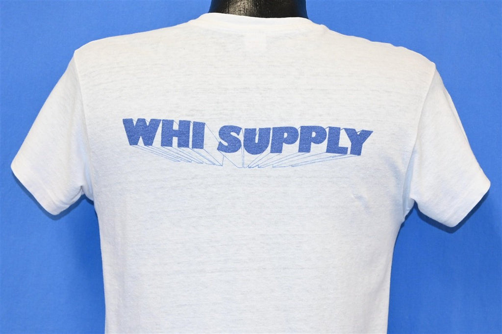 This cool vintage tee reps Rockwell International on the front and WHI Supply on the back. WHI Supply was most likely a local hardware store where folks could buy Rockwell tools. Rockwell Intl. was a manufacturing conglomerate that was involved in tons of industries, including automotive, printing, space travel, defense, and power tools.