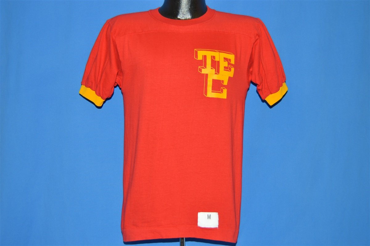 This vintage tee dates back to the 1970s and appears to have belonged to a student athlete aka #3. Features the abbreviations TEC, possibly for the name of that university, college, or high school. The team colors are red and yellow.