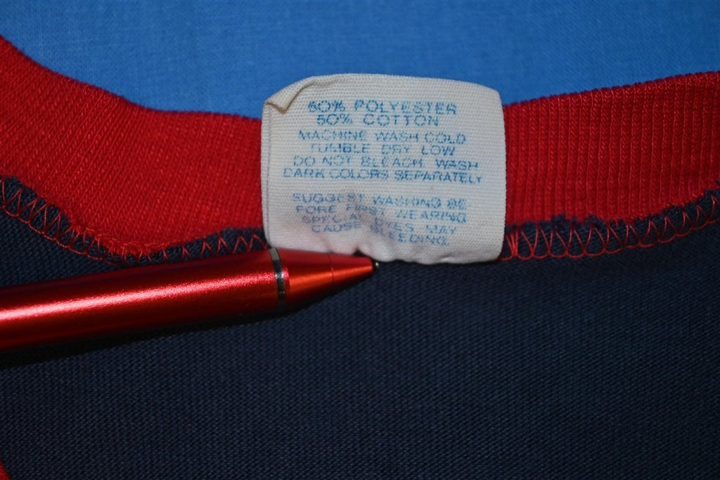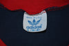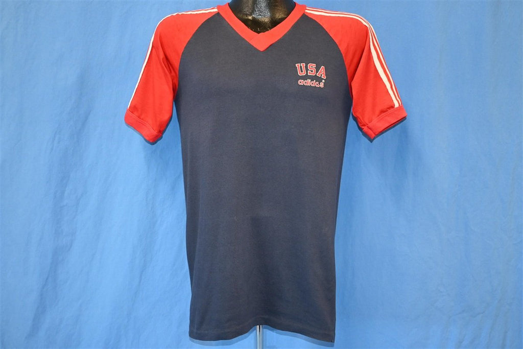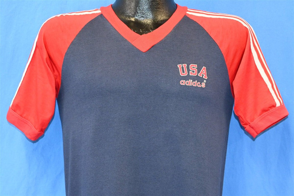 This Adidas tee dates back to the 1980s and truly captures the style of that era. Features a classic jersey style with raglan sleeves, soft poly cotton, and a roomy v-neck collar. Great patriotic color scheme of red, white, and blue.