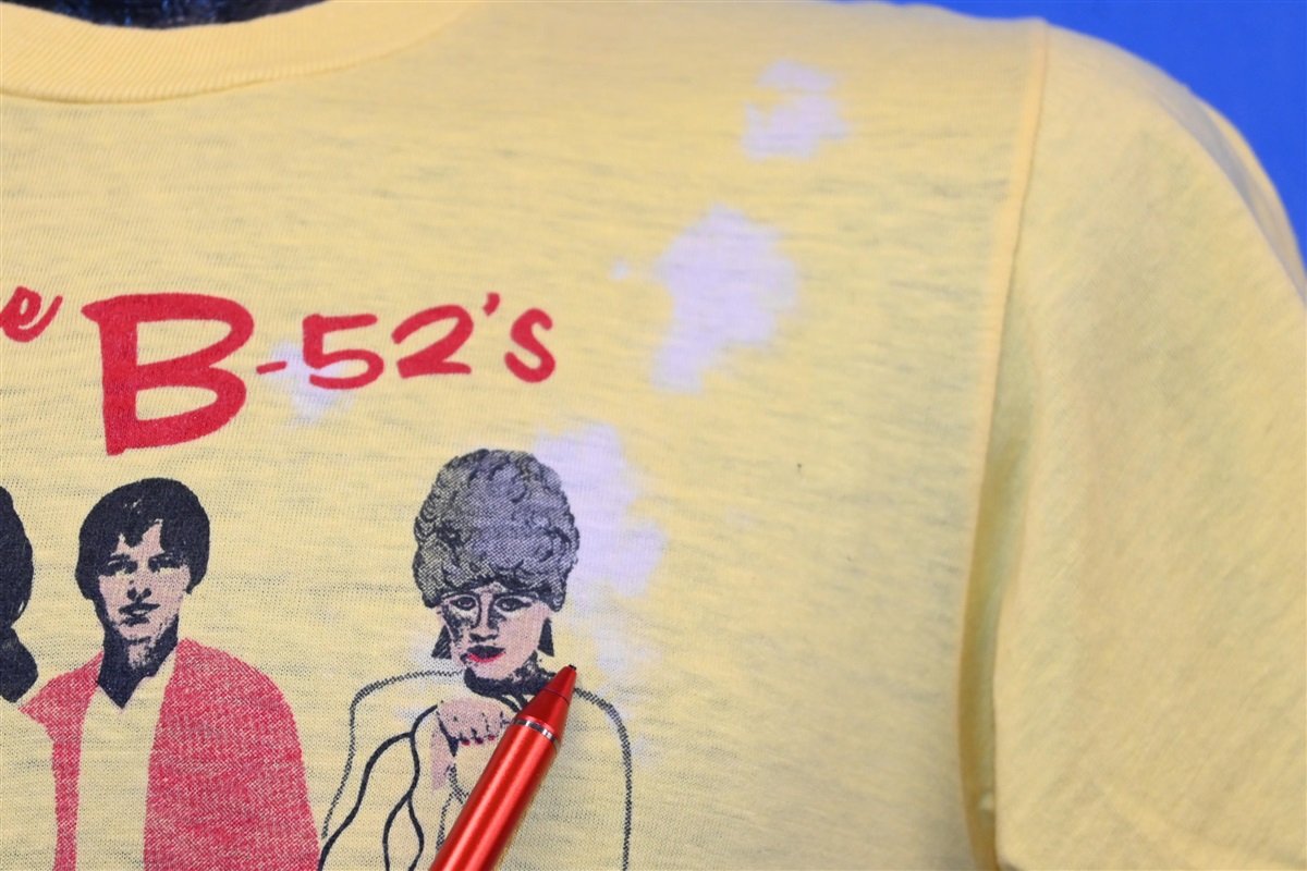 This incredible vintage band tee is for the iconic new wave group the B-52s, and it celebrates their eponymous debut album. This tee features the same portrait of the band that was used for the album's cover, and the image was designed by Tony Wright, an artist who also worked with Steve Winwood, Bob Dylan, and the Ramones.