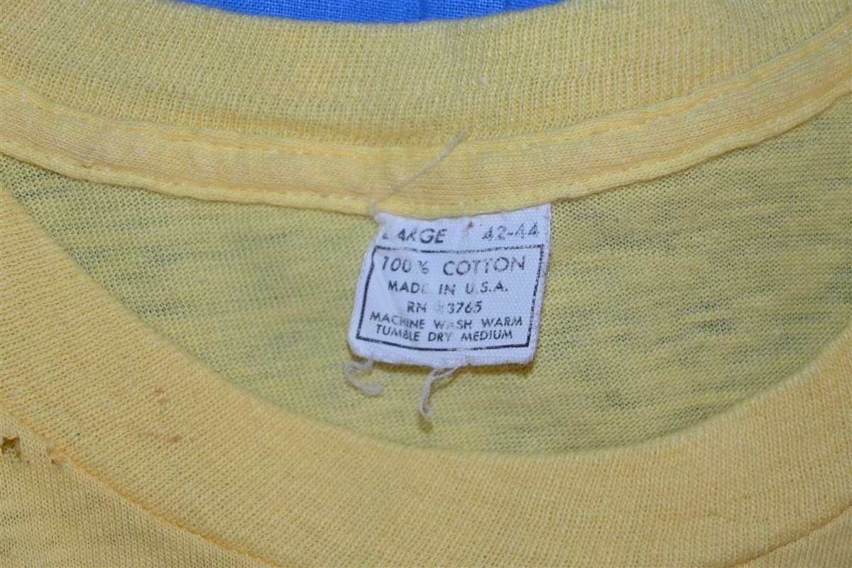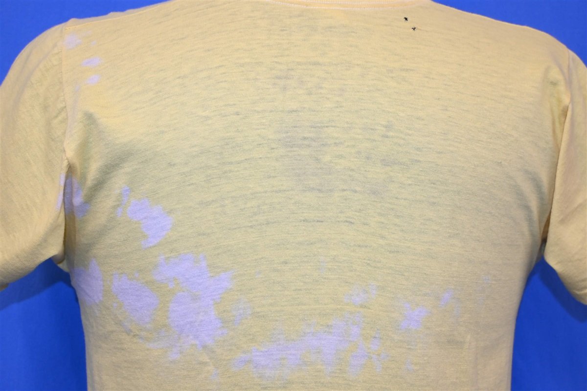 Fits like a modern unisex adult small. This shirt has some small holes and discoloration, see pics.