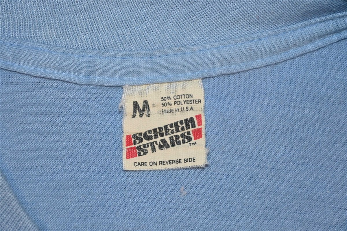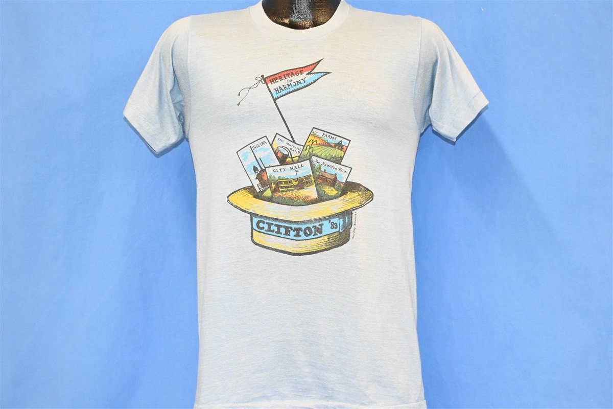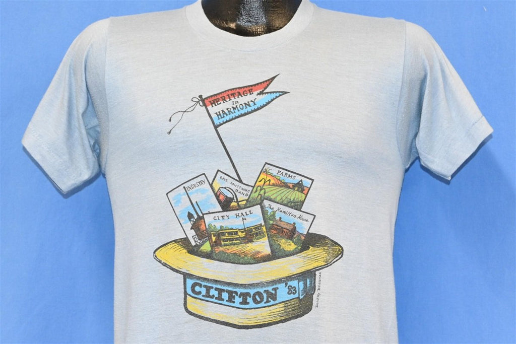 This great tee is from the Heritage in Harmony Festival of 1983 in Clifton, New Jersey. This graphic features the Dutch flag because Clifton was settled by immigrants from the Netherlands. The graphic also showcases some local landmarks like the Hamilton House and City Hall.