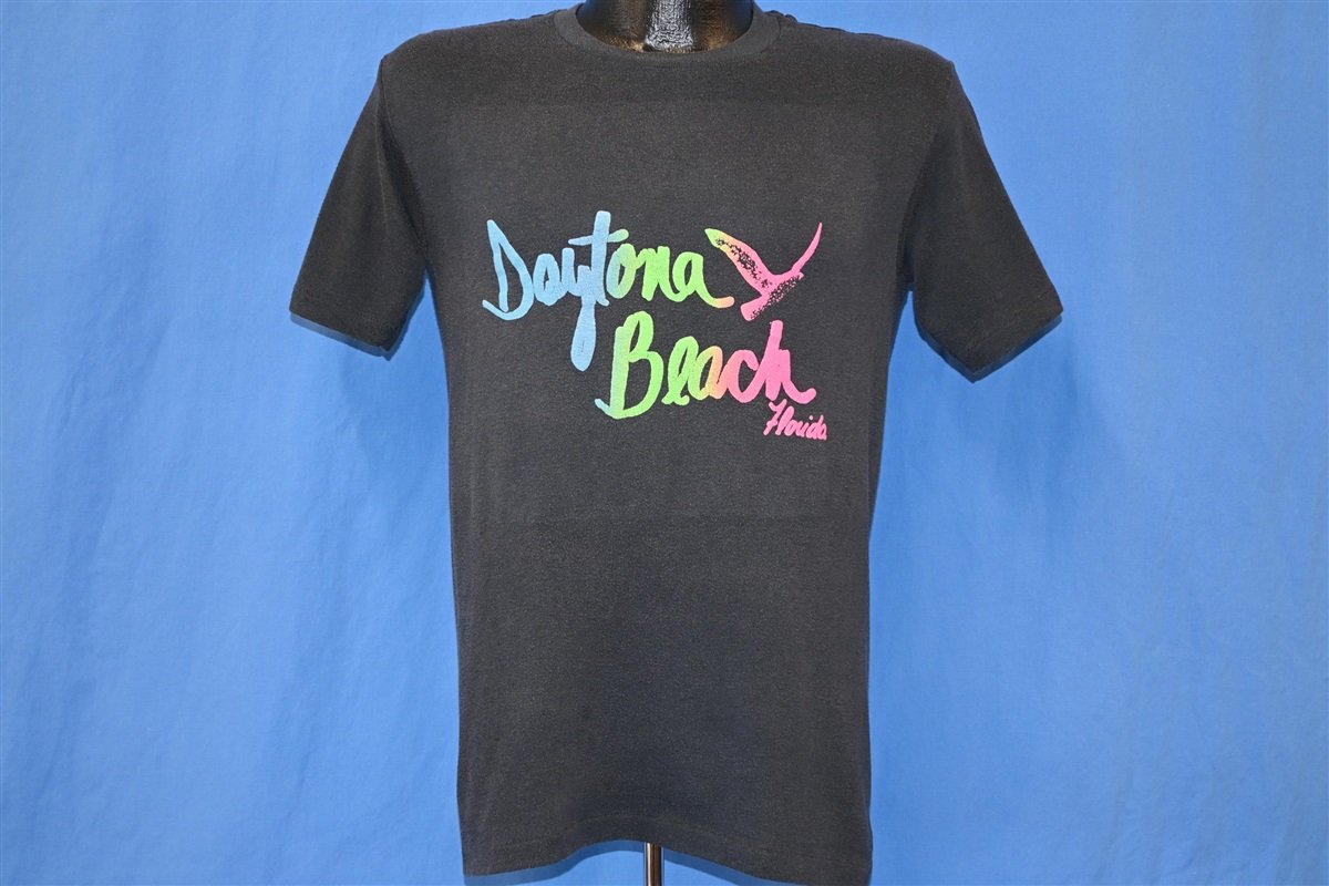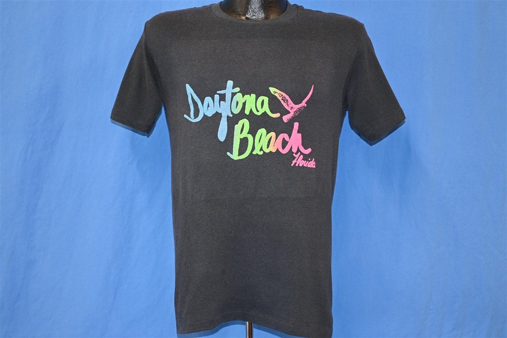 This tourist tee comes from the awesome city of Daytona Beach, FL sometime in the 1980s. It's held up great after all these years, perfectly capturing that cool eighties vibe with rainbow puffy paint graphics.