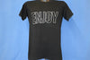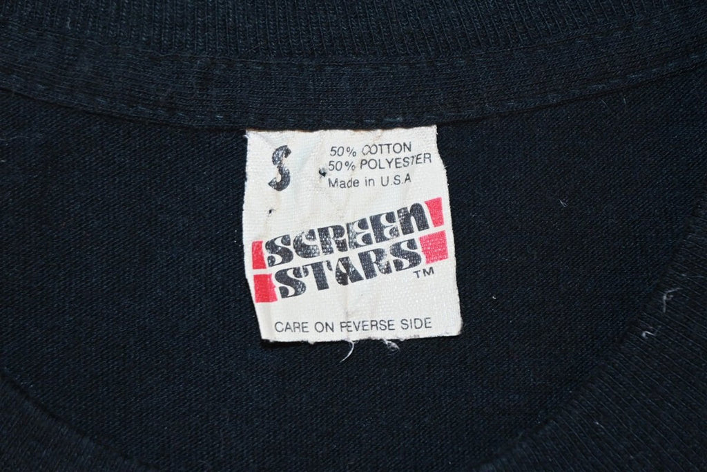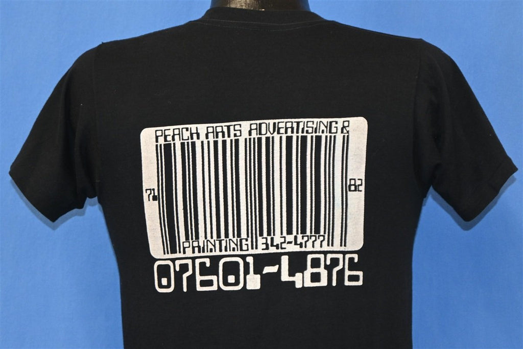 This cool tee was made to rep for the state of New Jersey. This tee says "ENJOY", with the N and J highlighted. The shape of the state is also depicted in the letter O. The back of this tee has a barcode graphic for Peach Arts Advertising, which was a local advertising business in the town of Hackensack.