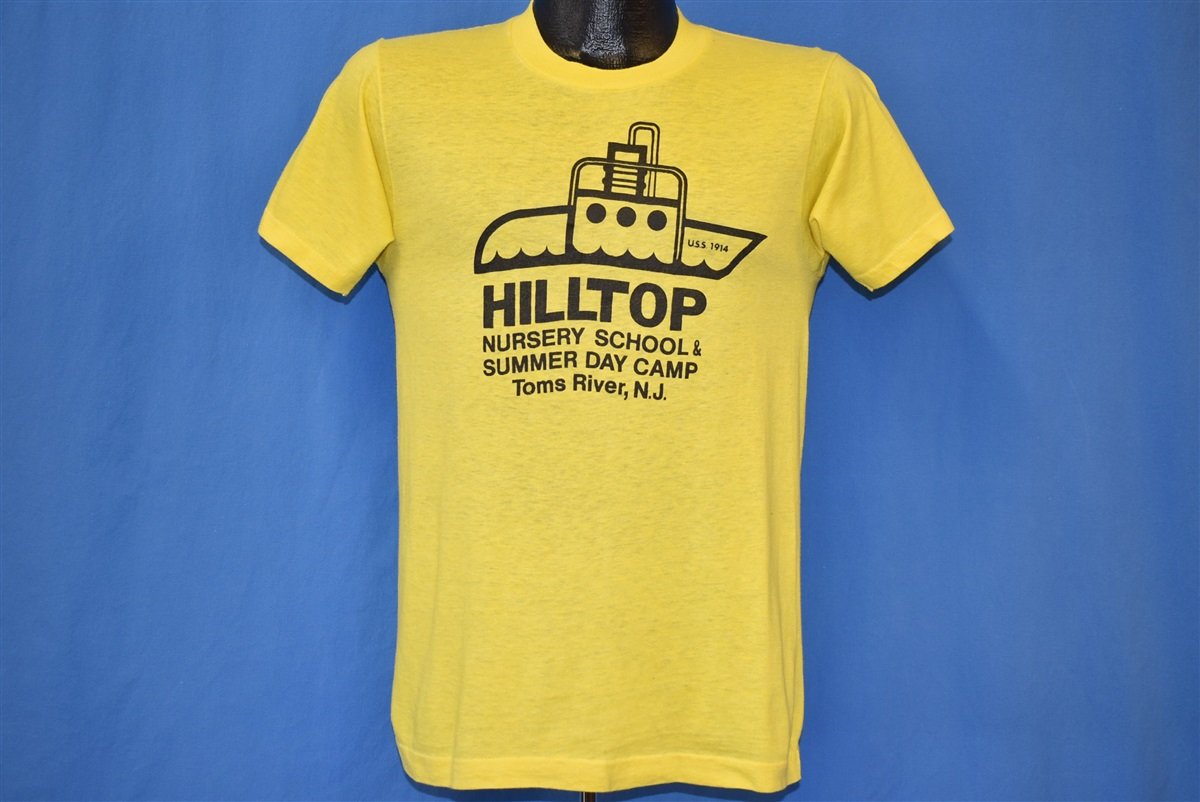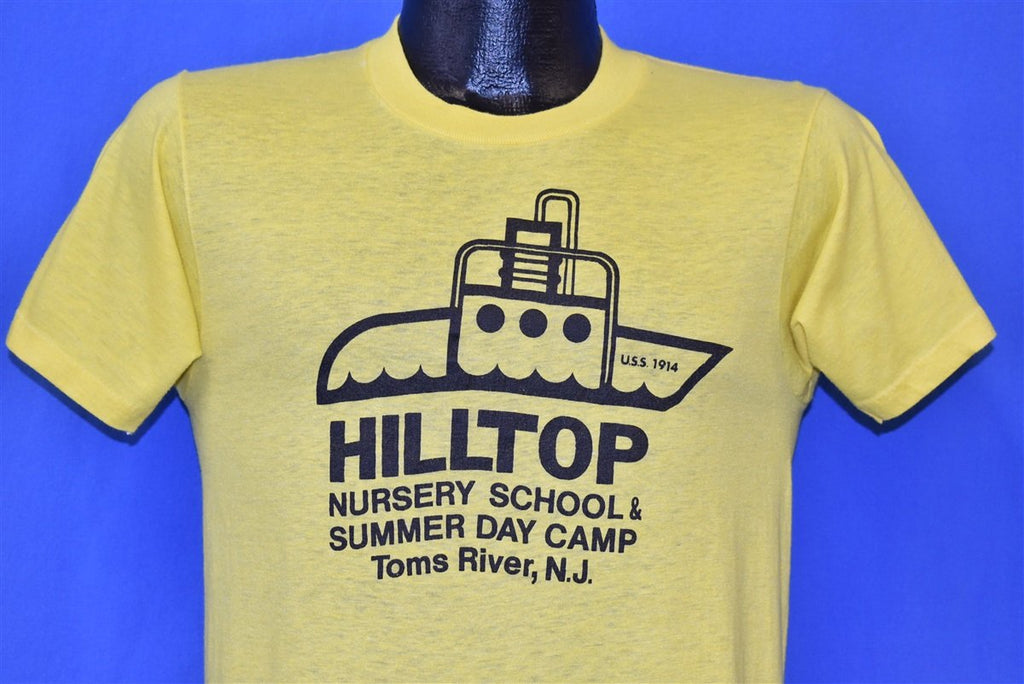 This vintage tee was custom made for Hilltop Nursery School in the eighties. It's aged really well and ready for many more years of wear. Features soft poly cotton, a classic Screen Stars tag, and cool graphics for that true vintage look and feel. Their boat logo on this tee is still used to this day.