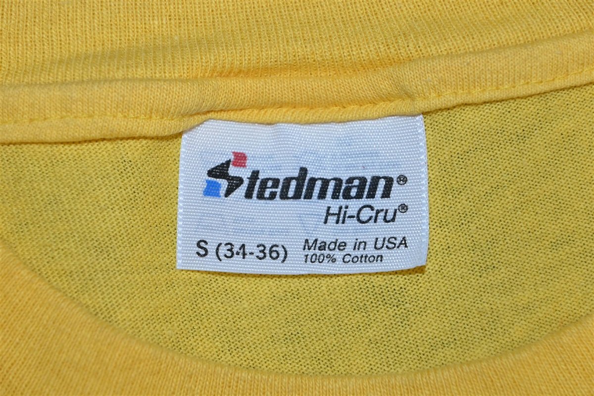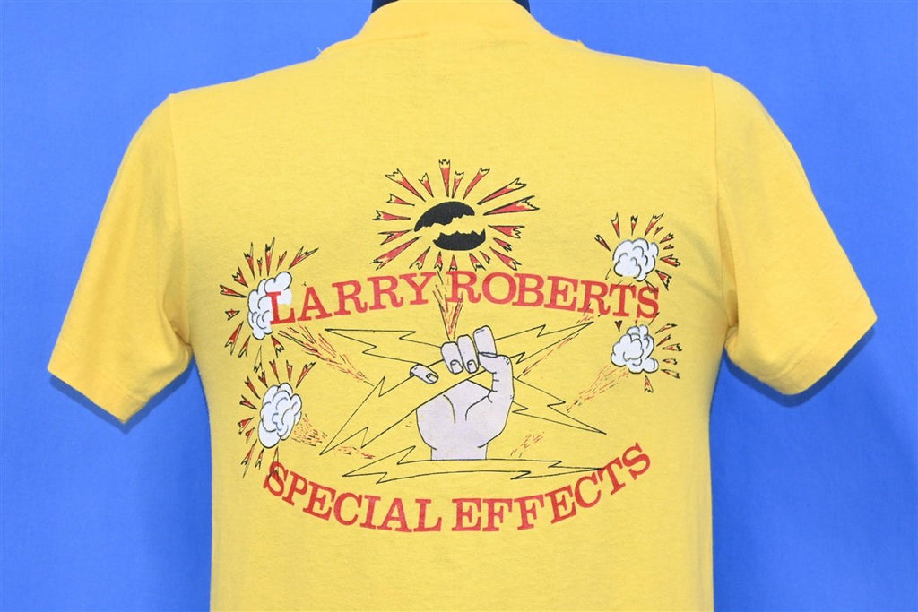 This awesome double-sided pocket tee promotes Larry Roberts Special Effects. Larry Roberts has had a long career in the film and television industry, and some of his earliest work was for 60s science fiction series like Lost in Space and Voyage to the Bottom of the Sea. With a military background, Roberts eventually began specializing in pyrotechnics for film. One of his most well-known credits was the 1997 natural disaster movie, Volcano starring Tommy Lee Jones. However, this shirt was made a little earlier in his career. It was made during the 80s, when Roberts was working on films like Masters of the Universe and Trick or Treat.