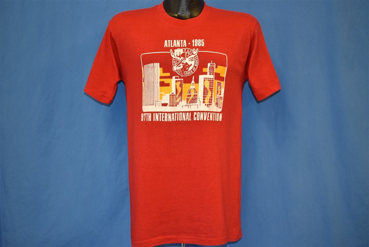 This bright red t-shirt is for the 97th International Convention of the Loyal order of the Moose, which took place in Atlanta in 1985. The Loyal Order of the Moose is a fraternal and service organization which was founded back in 1888. The non-profit is headquartered in Mooseheart, Illinois and they support the operation of Mooseheart Child City & School for children and teens in need. They also conduct numerous sports and recreational programs.