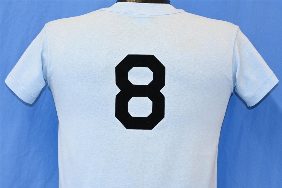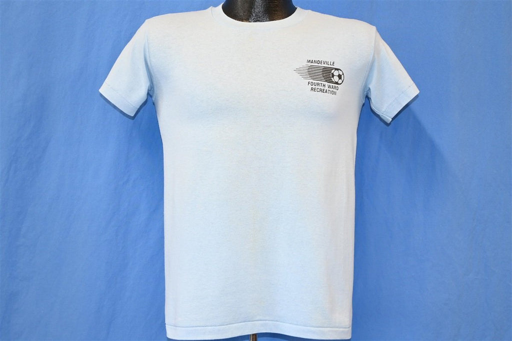 This light blue vintage tee is likely an old youth soccer uniform from a league run by the Mandeville Fourth Ward Recreation group. The front features a small logo for the organization while the back has the number 8. The Fourth Ward Recreation group was started in the 80s by volunteers who wanted to improve the recreation of the children of Mandeville, Louisiana. In addition to starting a number of youth sports programs, they also funded the creation of Pelican park.