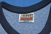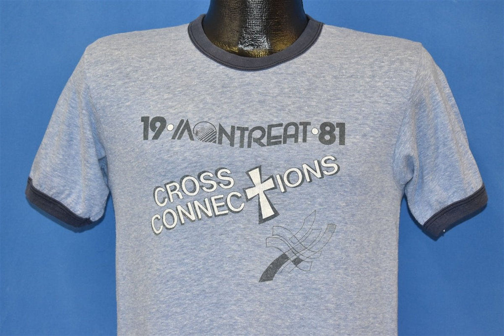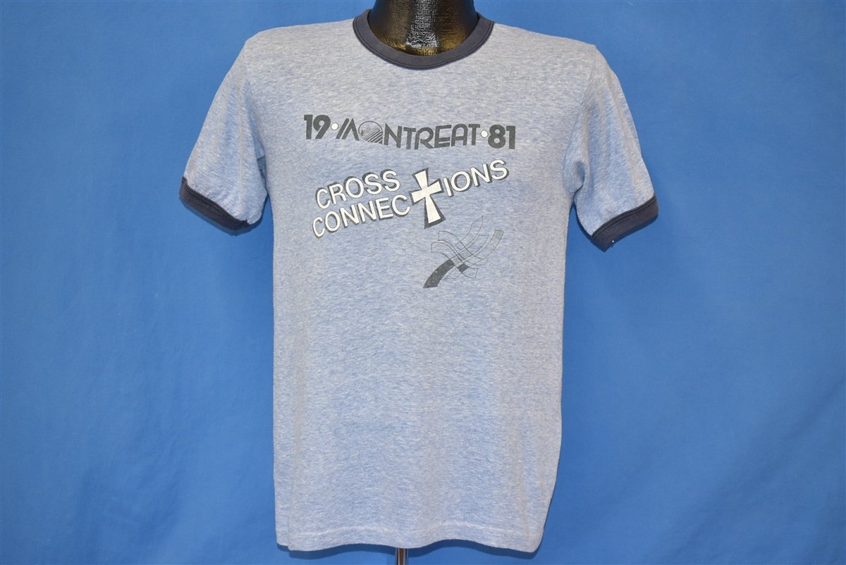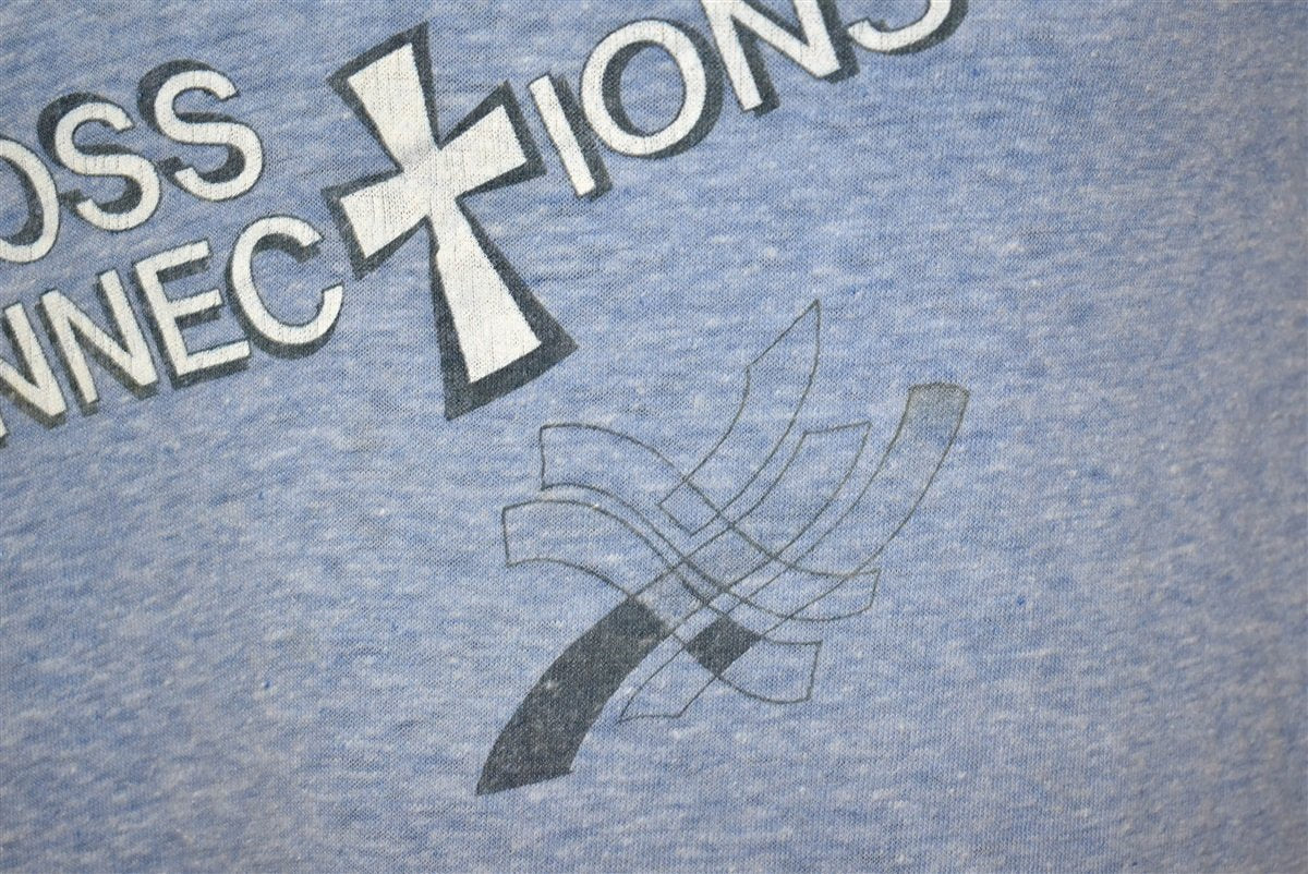 This 80s t-shirt from 1981 Cross Connections in Montreat. It has a what appears to be a Christian cross on the front. This is a heather blue ringer and there appears to be some discoloration on the front in the graphic, see pic.