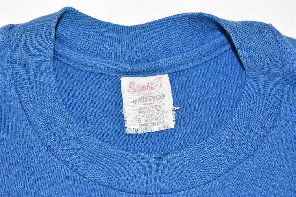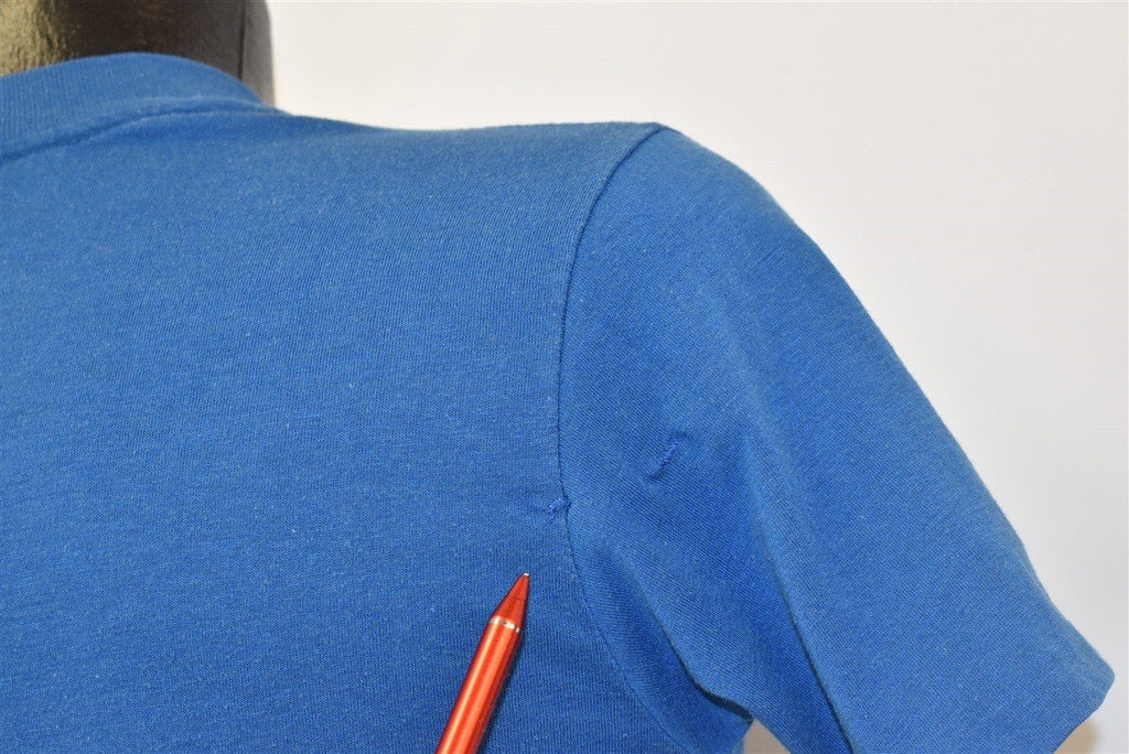 The tag says medium but this shirt fits like a modern unisex adult small. There are two small repairs on the back shoulder, see pics.