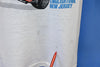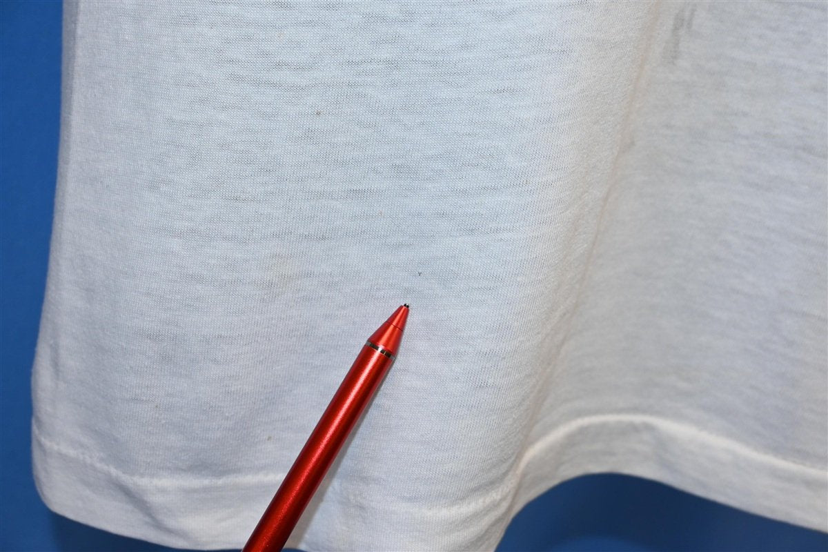 Fits like a modern unisex adult small. This shirt is soft and thin with some light spots and a small hole on the front, see pics.