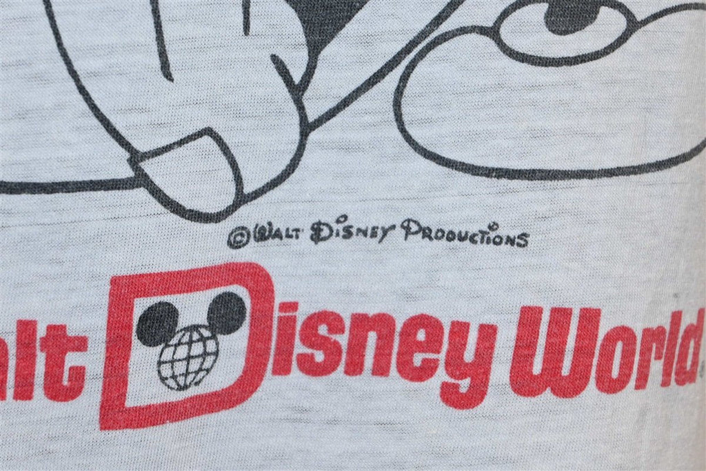 This delightful ringer tee is a vintage souvenir from Walt Disney World in Florida. This shirt features the theme park's beloved mascot Mickey Mouse, and it was made back in the 80s. During the decade, Disney World introduced two new exciting parks to their resort complex. These included Epcot in 1982, and what would eventually come to be known as Disney's Hollywood Studios in 1989. The company also opened their first water park in 1989, Disney's Typhoon Lagoon.