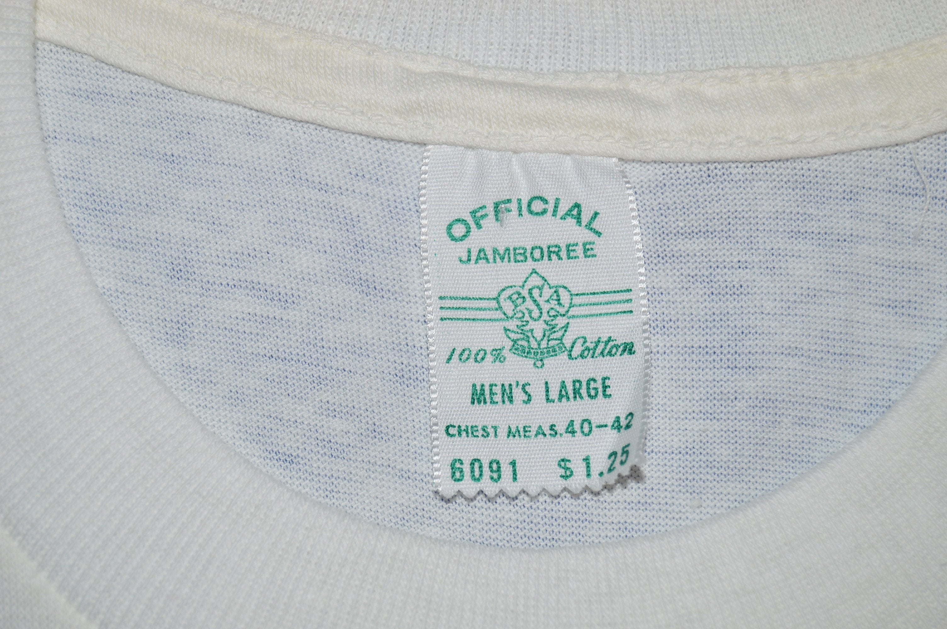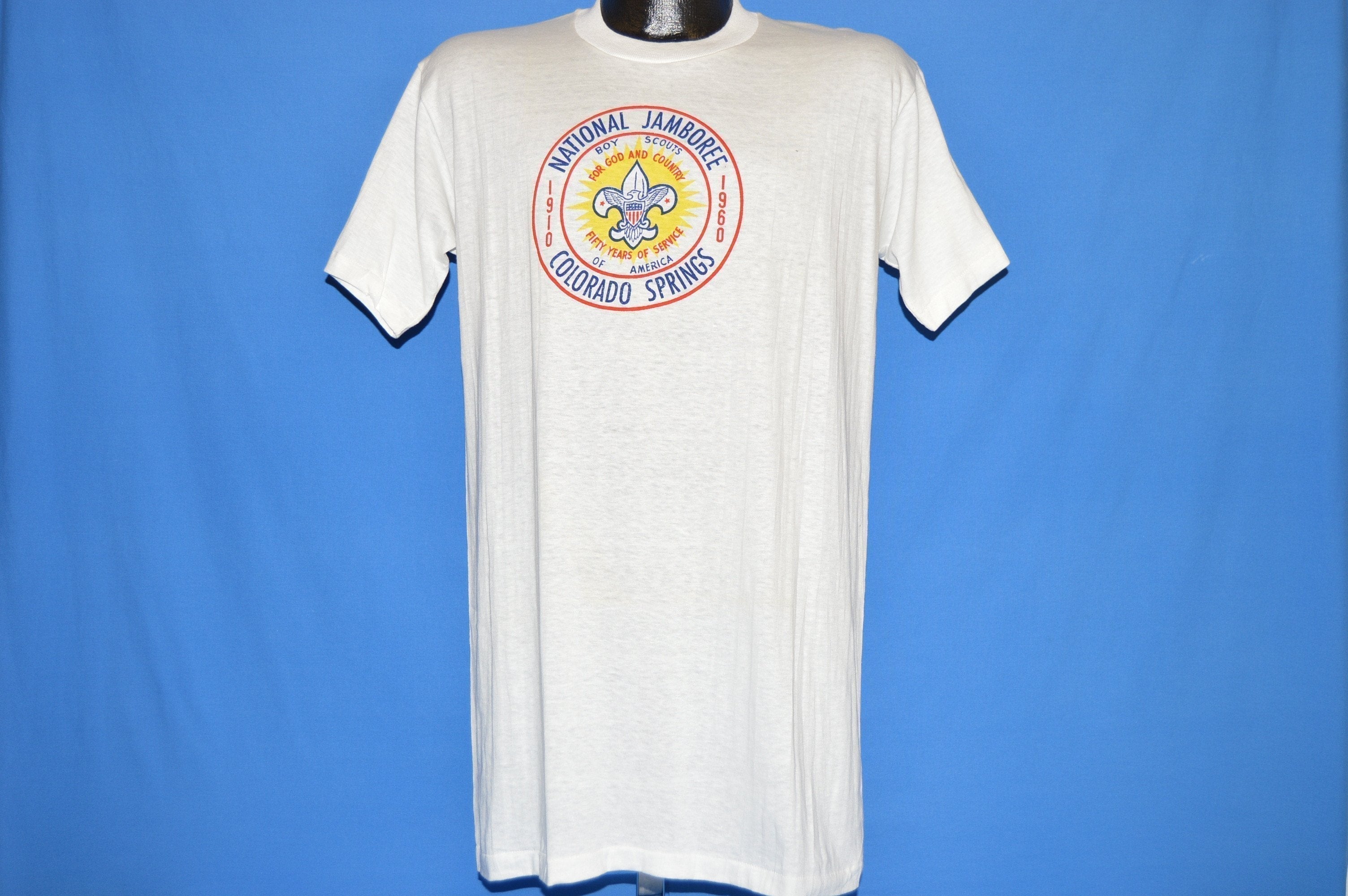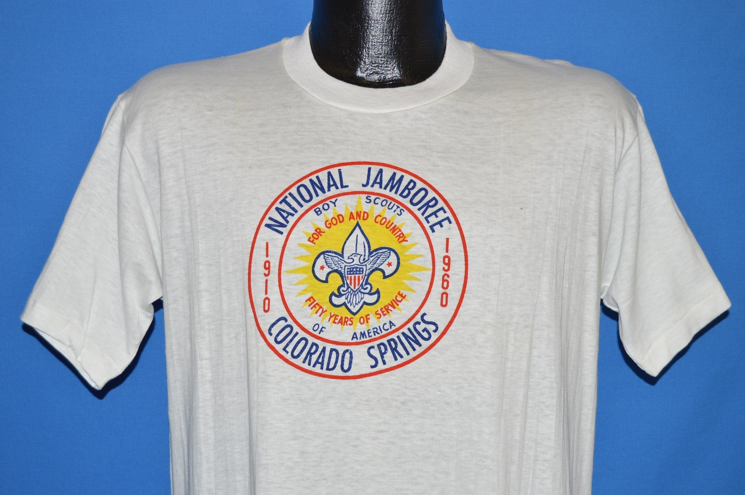 This white vintage t-shirt is from the 1960 Boy Scouts of America National Jamboree. The graphic from the event is of the BSA Fleur-De-Lis and commemorates the organization's 50th anniversary. The Jamboree took place in Colorado Springs. The National Scout Jamboree is an event which first took place in Washington D.C. in 1937. The event is typically held every four years and it attracts thousands of scouts from around the United States. The theme of the 1960 Jamboree was "For God and Country"
