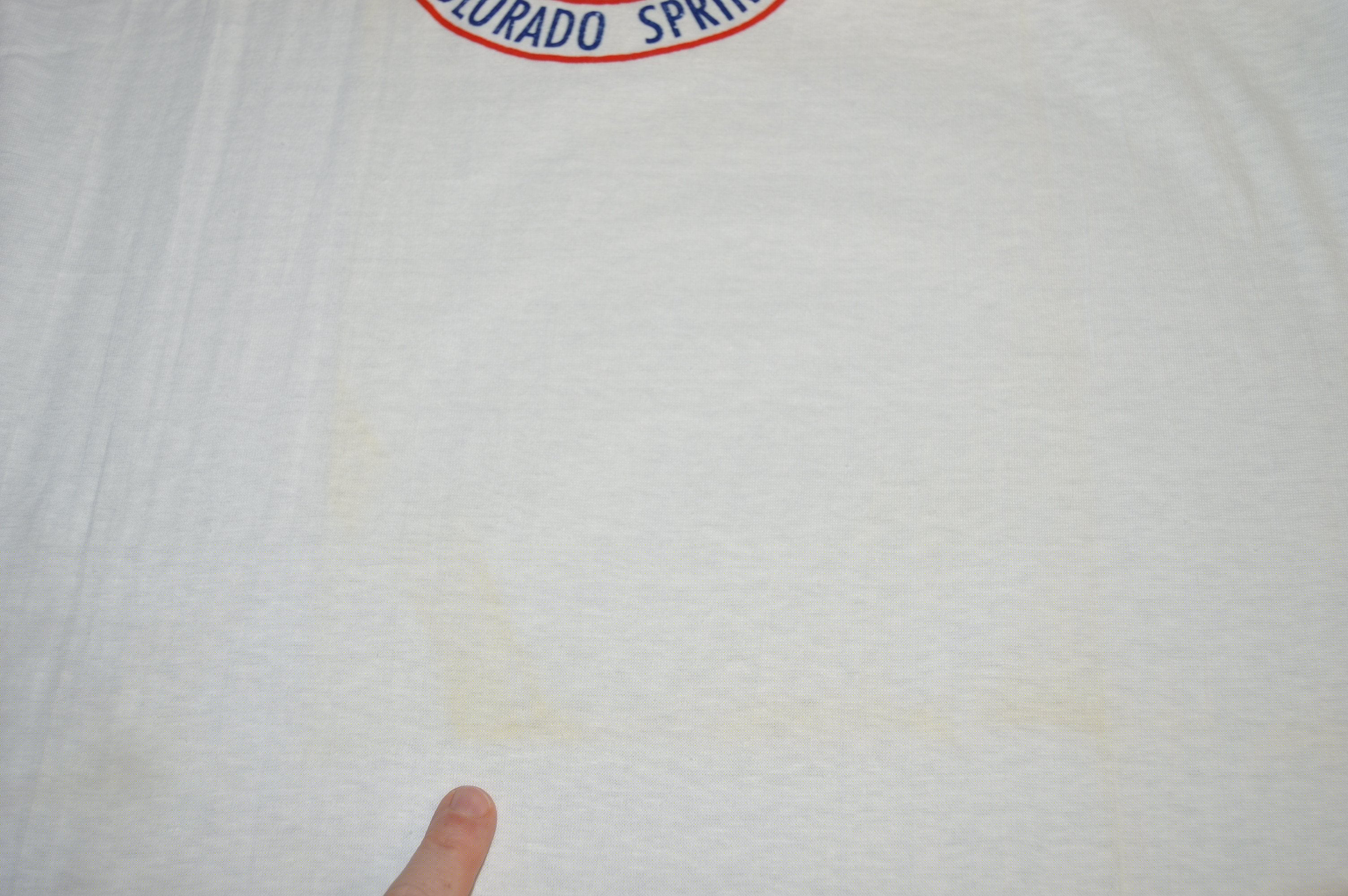 The tag says large but this shirt fits like a modern unisex adult medium. This shirt is deadstock, unworn. There is some discoloration, see pics.