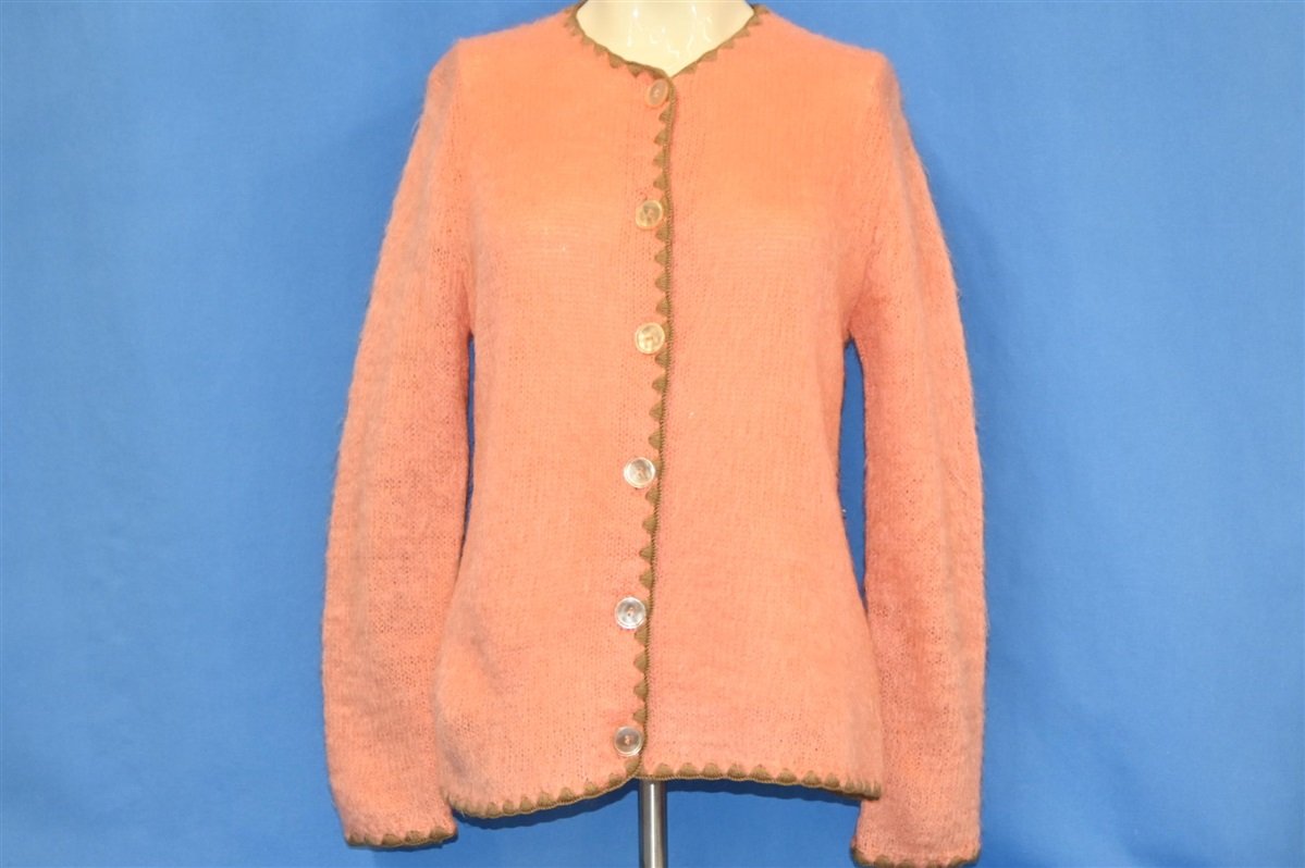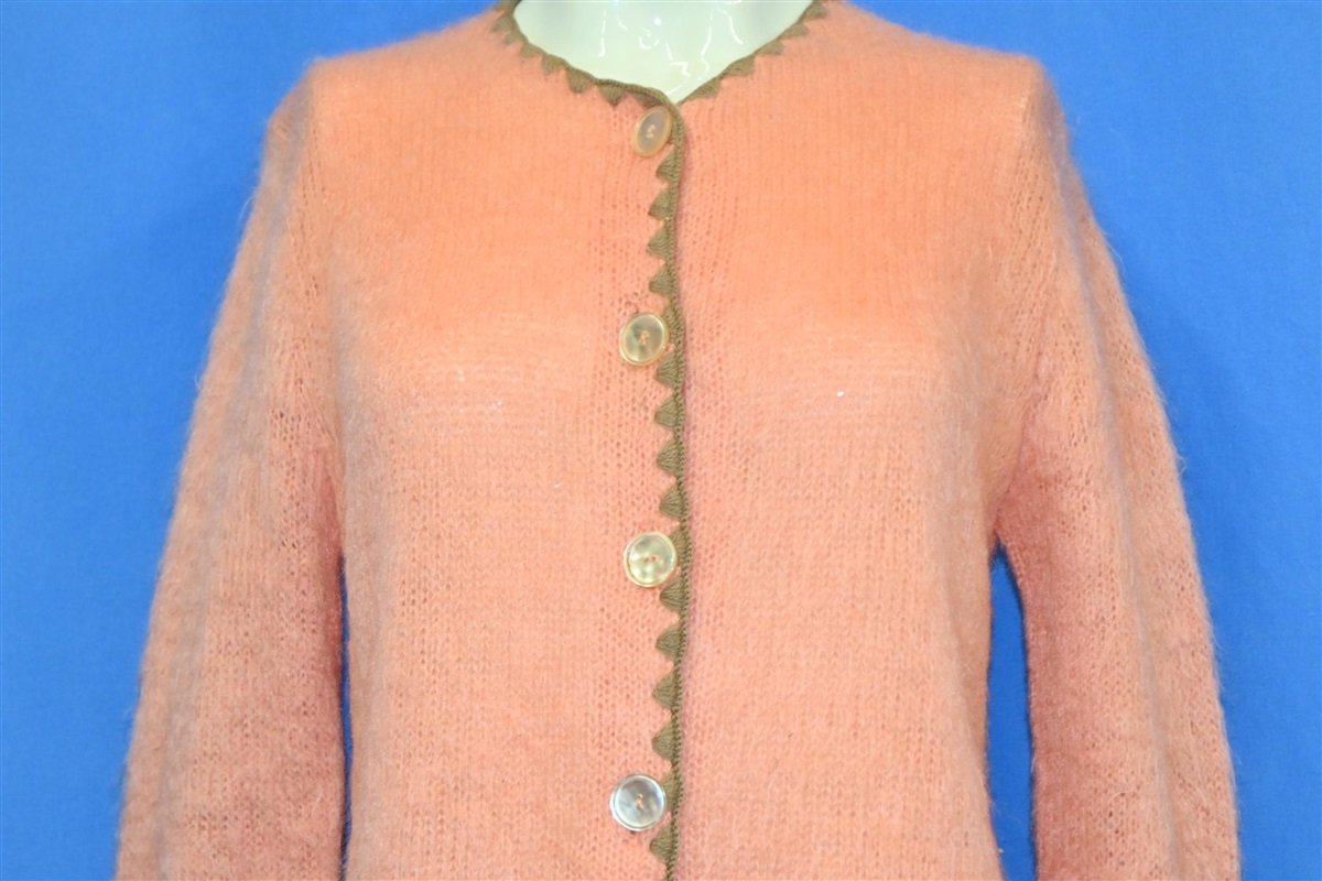 This luxuriously soft cardigan was made in the 70s. The sweater is made from a beautiful mohair yarn, which has been dyed a nice salmony shade of pink. A small scalloped pattern decorates the edges of the sweater, and it also features pearlescent button closures.