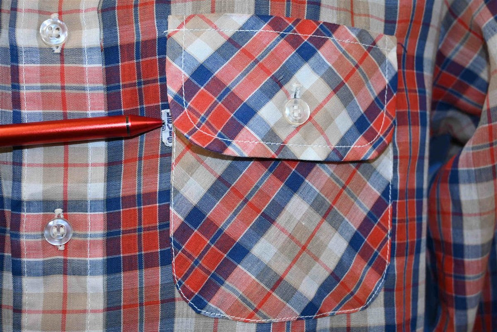 This wonderful button down was made by Levi's and it features the company's signature tab tag on the pocket. This tag has a capitalized E, which was a stylistic choice that Levi's eventually dropped from their logo. The shirt has a colorful plaid design, and it also has a big style collar, which was quite popular during the 1970s.